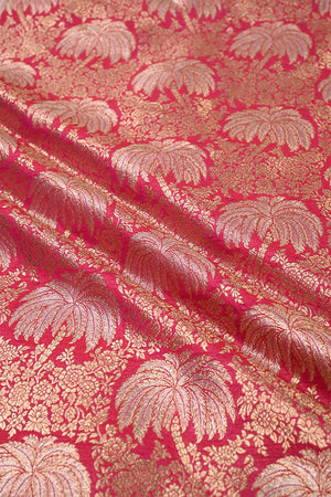 This Pink Banarasi silk fabric features an intricately designed floral jaal pattern woven with gold zari. The fabric is further enhanced with distinctive coconut palm tree motifs in gold and silver zari, thoughtfully placed within the jaal design to add character and charm.