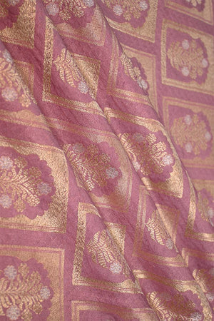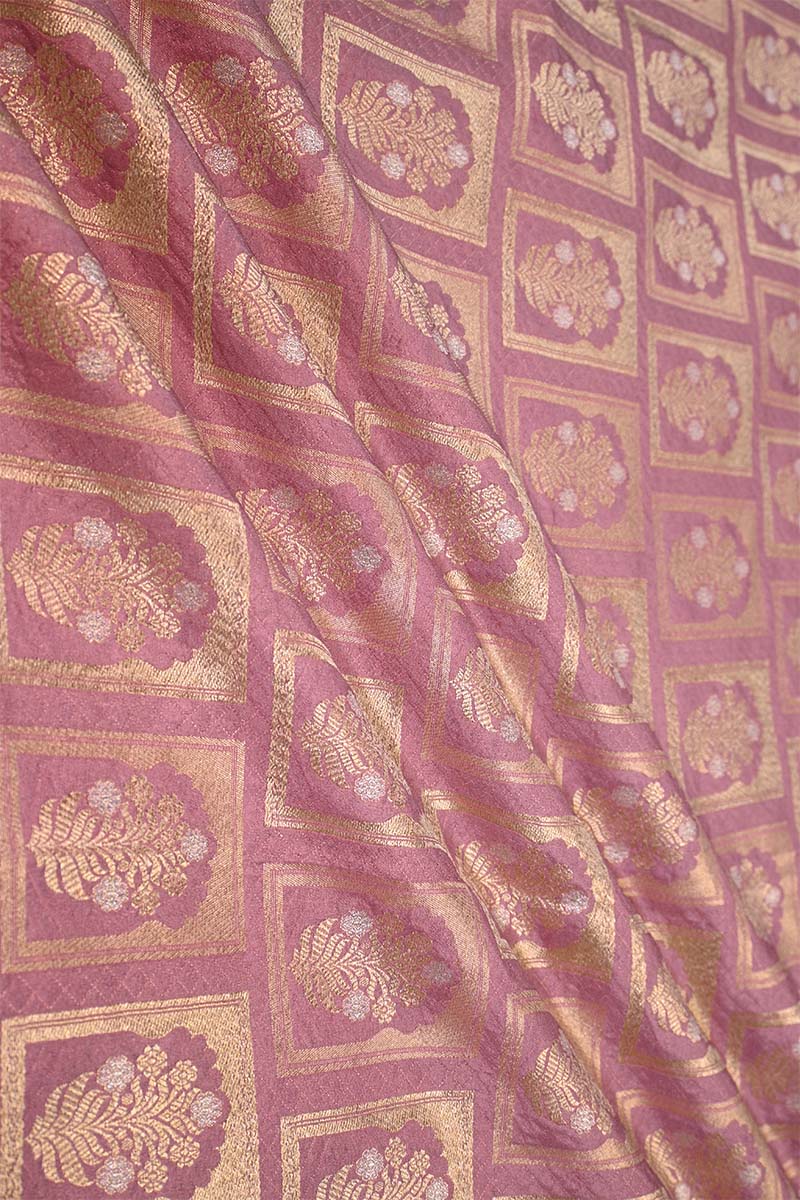 This pink, pure Banarasi silk fabric features an intricate pattern inspired by Rajwada floral ornament architecture, woven with gold and silver zari throughout the fabric. The combination of delicate motifs and dual-tone zari makes it an excellent choice for stunning blouses or dresses.