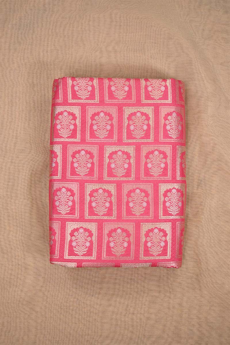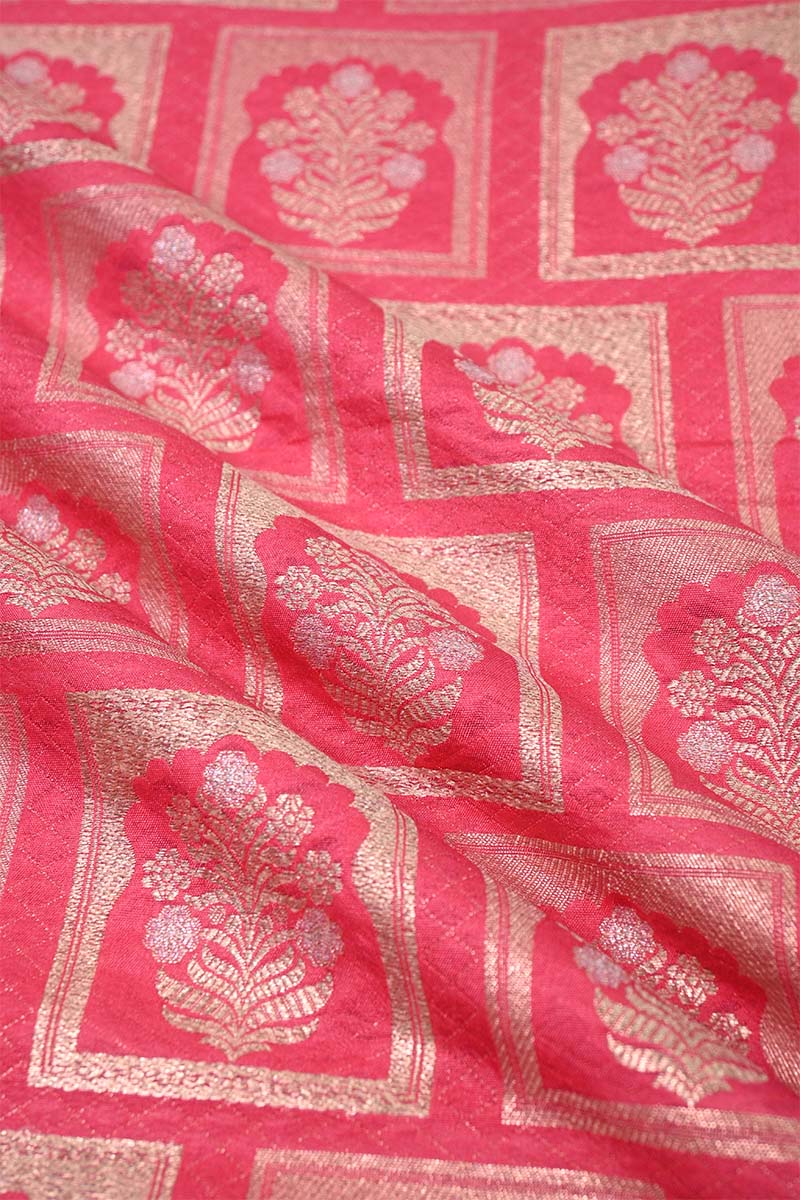 This Pink Banarasi silk fabric features an intricate pattern inspired by Rajwada floral ornament architecture, woven with gold and silver zari throughout the fabric. The combination of delicate motifs and dual-tone zari makes it an excellent choice for stunning blouses or dresses.