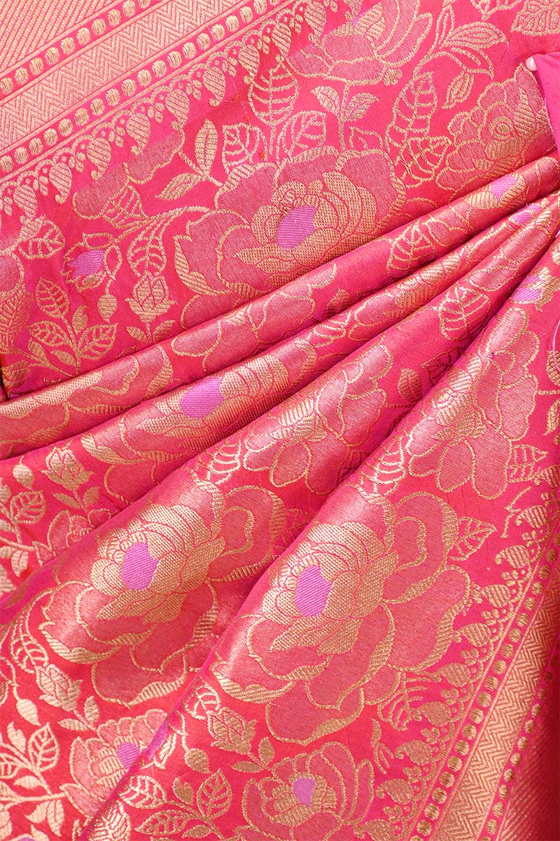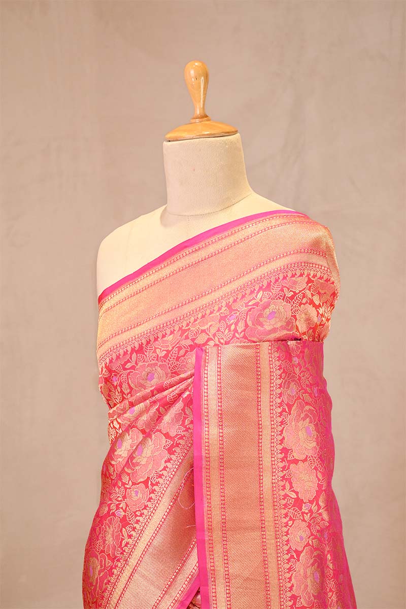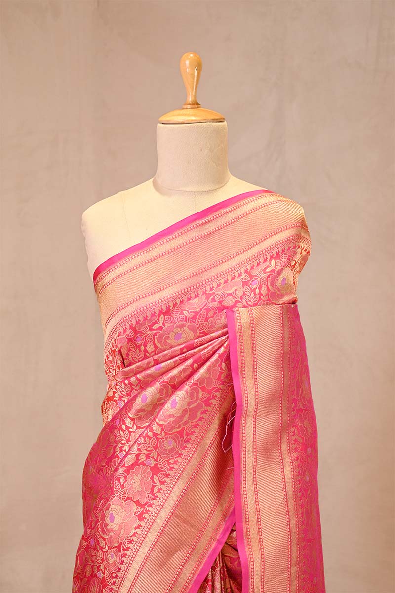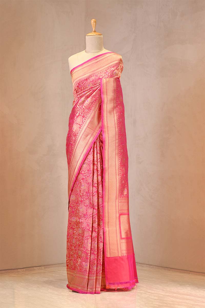 This Pink pure Banarasi katan silk saree is adorned with an intricate gold zari woven rose motif jaal, highlighted with purple meenakari detailing across the body. The border and pallu are woven with a geometric brocade pattern in gold zari. It is paired with a matching Pink blouse piece finished with a gold zari woven border.
