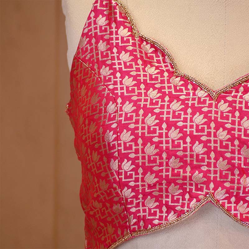 This pink Banarasi Katan silk blouse is designed with golden zari woven Pichwai jaal work in a geometrical pattern spread across the fabric. Styled as a strap blouse, it features a scalloped neckline embellished with delicate Cutdana work, making it a standout piece for festive and special occasions.