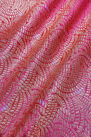 This pink brocade Banarasi silk fabric showcases a beautiful combination of gold and silver zari with an intricate jaal woven pattern. The elegant design makes it an ideal choice for crafting a stunning blouse or dress.