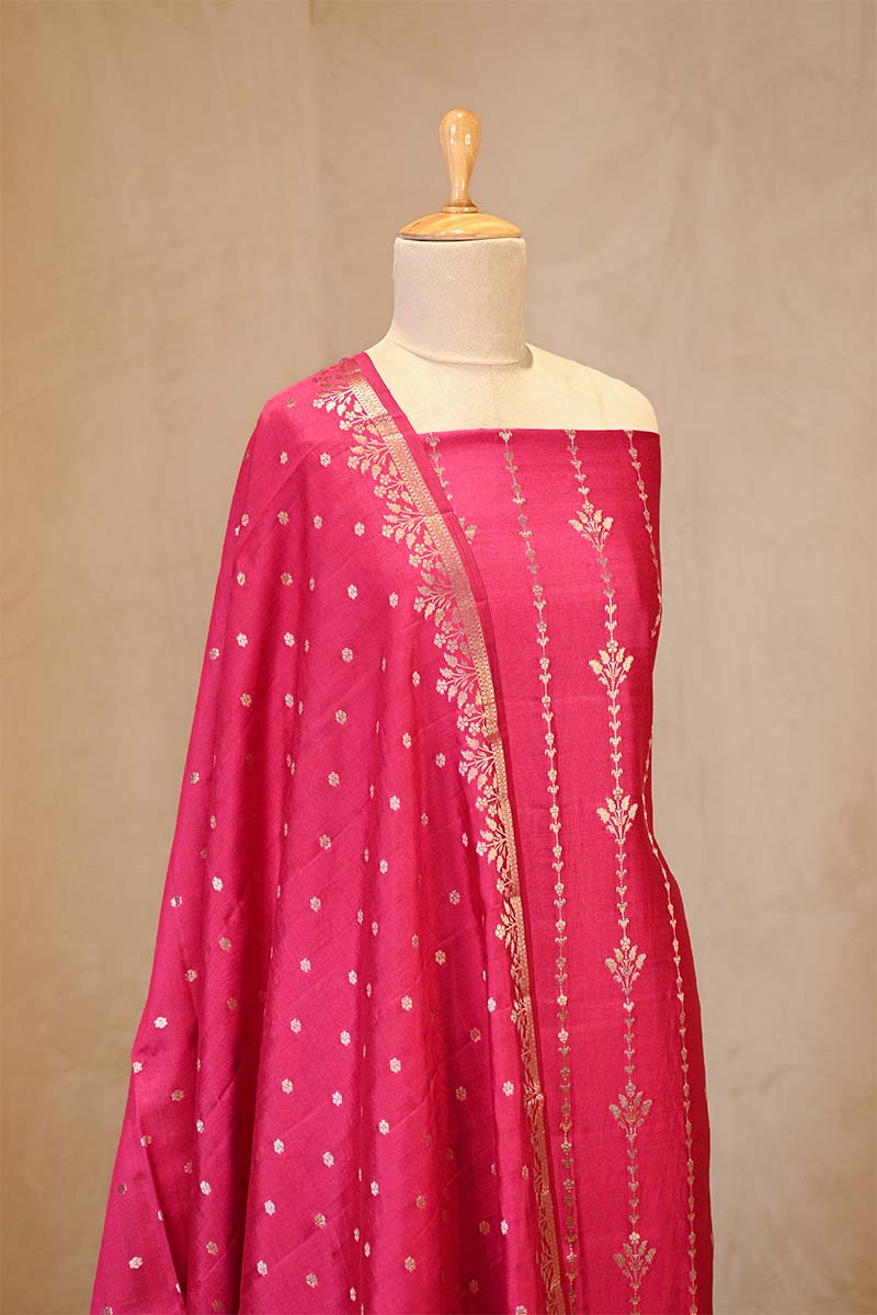 This pink Chiniya silk suit set is a graceful choice for festive and cultural occasions. The kurta features gold zari woven floral ethnic stripes, adding a traditional touch to the design. Paired with a woven matching dupatta and a matching bottom pant, this dress material offers a complete and well-balanced ensemble for special events.