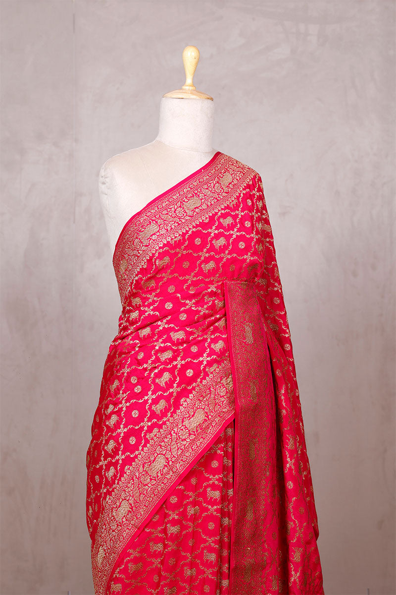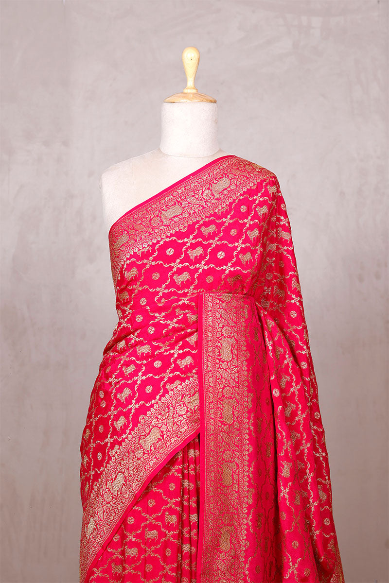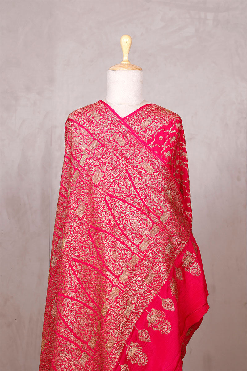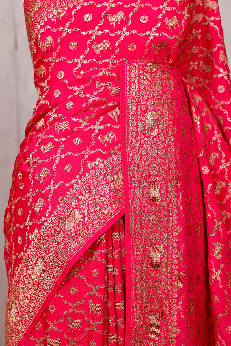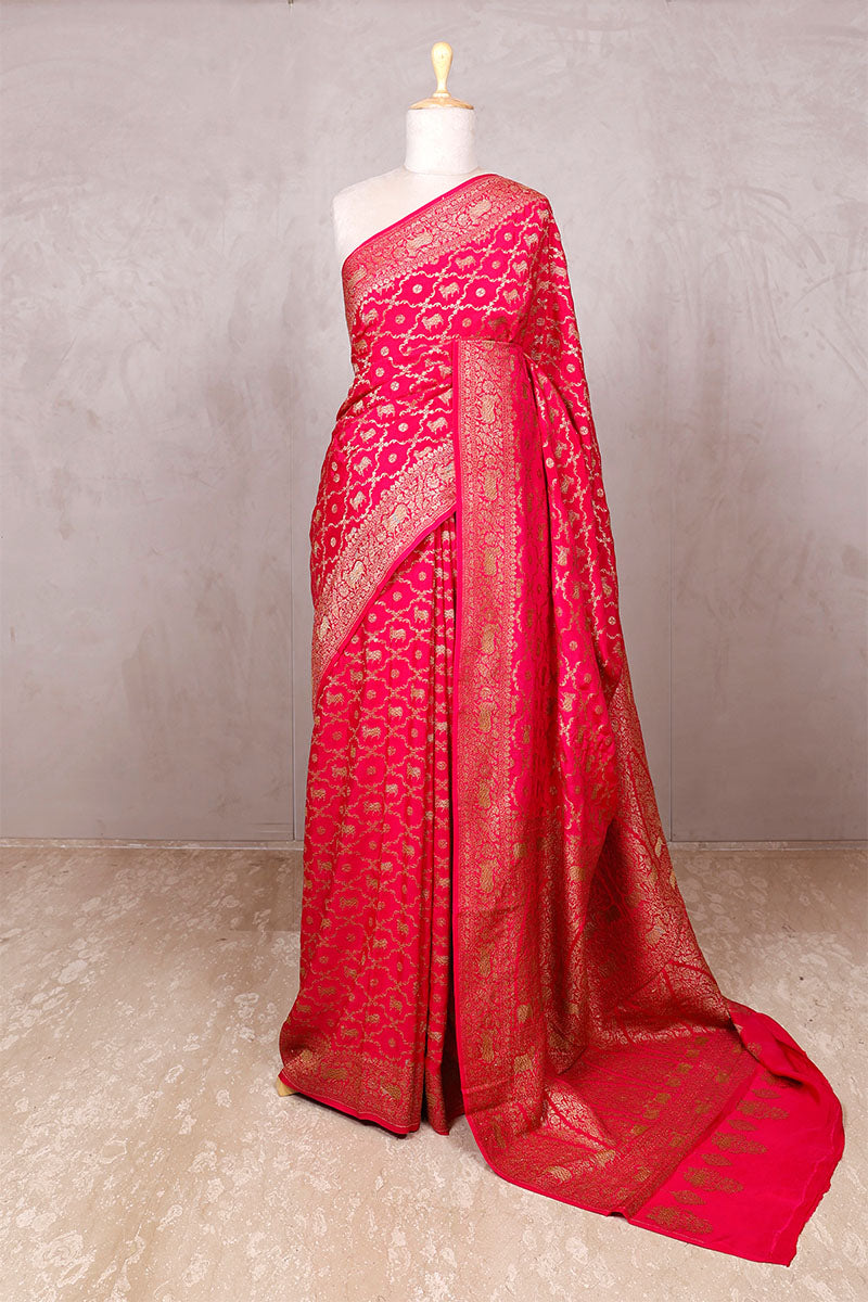 This Pink crepe Banarasi khaddi silk saree is handloom woven with an intricate gold zari Pichwai floral jaal spread across the body, showcasing delicate detailing. The border and pallu have gold zari woven Pichwai floral patterns. It comes with a matching unstitched blouse piece, for customized tailoring.