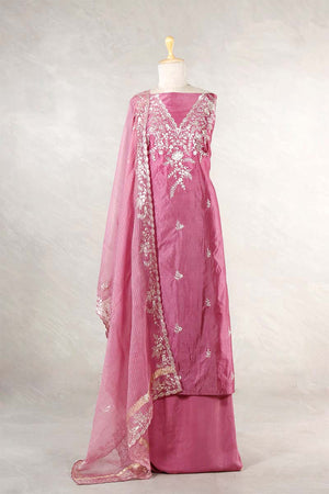 This Pink dupion silk suit set is designed for festive gatherings and traditional functions. The kurta features a V-shaped neckline with detailed floral pitta zari embroidery and is further enhanced with pitta zari woven floral buti and embellished motifs throughout. It is paired with an embellished organza silk dupatta that includes hand-embroidered buti and a scalloped embellished border. A plain silk matching bottom fabric completes this dress material set.