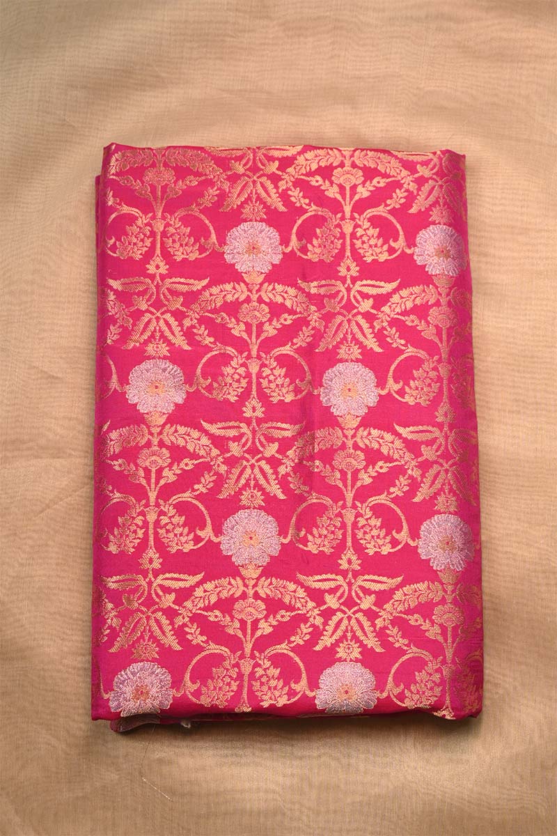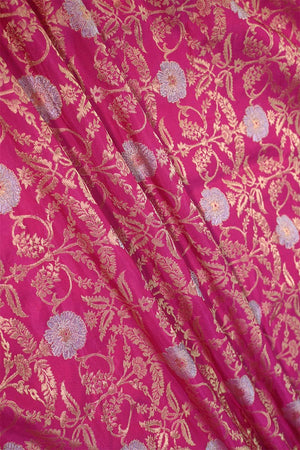This pink handloom Katan silk fabric features a beautifully intricate floral jaal pattern woven in gold and silver zari across the fabric. Its intricate detailing and smooth texture make it a premium choice for blouses, lehengas, or traditional attire.
