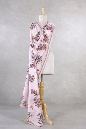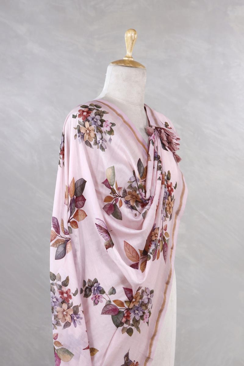 This pure linen dupatta is made in a soft pink shade and features a charming blend of floral and kingfisher bird digital prints spread across the fabric. The detailed leaves and natural elements in the design give the dupatta a refreshing, lifelike appearance.