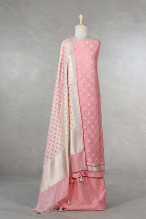 This Pink mulberry silk unstitched suit set showcases traditional artistry with watergold zari and pink meenakari woven floral buti across the kurta. The hemline is finished with a zari woven border, adding a classic touch. Paired with a matching Pink cotton silk bottom pant, the ensemble is completed with a mulberry silk dupatta featuring watergold zari and meenakari woven floral jaal. A graceful salwar suit piece for festive wear, weddings, or special cultural occasions.