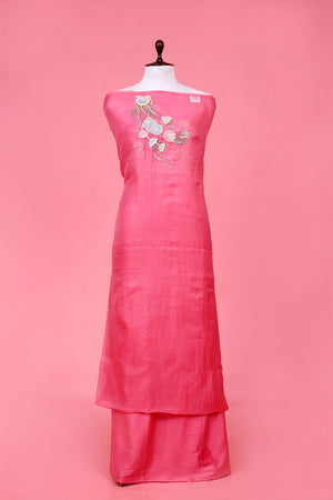 This pink organza silk 2-piece suit set is a delightful choice for festive and formal occasions. The kurta is embellished with a hand-embroidered marine motif on the neckline, adding a unique design element. Paired with a coordinated bottom, this suit piece offers a stylish yet comfortable look.
