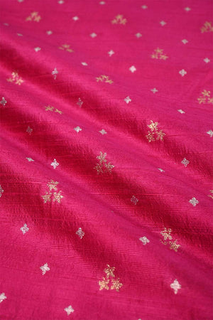 This Pink raw silk fabric features intricately woven star motifs in gold and silver zari spread evenly across the fabric. The rich texture of raw silk paired with the dual-tone zari detailing makes it a striking choice for festive and special occasion outfits.
