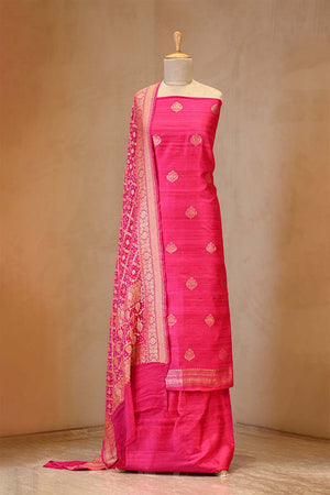 This Pink pure raw silk suit set is a classic choice for festive events and traditional gatherings. The kurta features gold zari woven buta all over, complemented by an antique zari woven border on the hemline. It is paired with a coordinated bottom fabric that also has an antique zari woven border. The set includes a pink bandhani dupatta, intricately woven with zari all over, completing this elegant dress material ensemble.