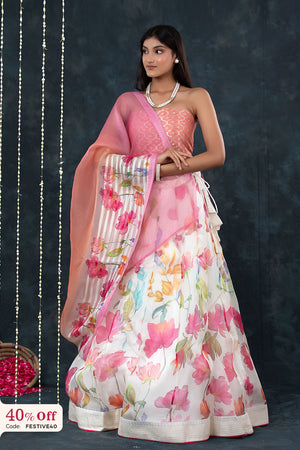 Make a style statement at the next important event in our organza silk lehenga. This white beauty features intricate embroidery and a rich, lustrous fabric. A symbol of grace and sophistication, this timeless beauty is designed for those who appreciate the finer things in life. The lightweight skirt is made of pure organza silk which has a digitally printed floral motif along with an embroidered border. Accompanied by a contrast unstitched blouse piece with silver zari woven geometrical motifs and a woven organza silk dupatta, this one is a worthy acquisition indeed.