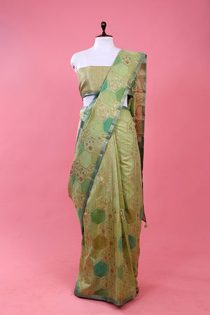 Step into elegance with this exquisite green Chiniya silk saree. Adorned with intricate gold zari woven geometrical motifs, it exudes sophistication. Handbrushed floral gold zari woven buta adds an artistic touch, complementing the woven 1-inch contrast border beautifully. Complete with a matching woven unstitched blouse piece, this saree is a statement of timeless grace and artistic finesse, perfect for any special occasion.