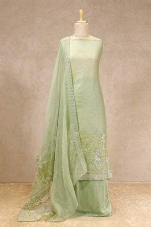 This Pistachio embellished organza silk suit set is an elegant option for festive and cultural events. The kurta is adorned with intricate aari work and resham embroidery featuring floral and mayur motifs along the hemline, adding a charming touch. Paired with an embellished organza silk dupatta accented with matching floral and mayur motifs, and completed with a plain silk matching pant, this dress material is perfect for special occasions.
