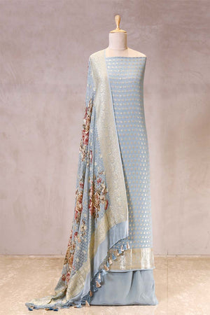 This Powder Blue Banarasi Georgette Khaddi silk suit set is designed for festive occasions and cultural gatherings. The kurta features gold zari woven floral buti all over, with an intricate gold zari woven border on the hemline for added detailing. It is paired with a floral printed Georgette Khaddi silk dupatta, enhanced with gold zari weaving, and a matching crepe bottom pant, making this dress material a well-coordinated choice for special events.