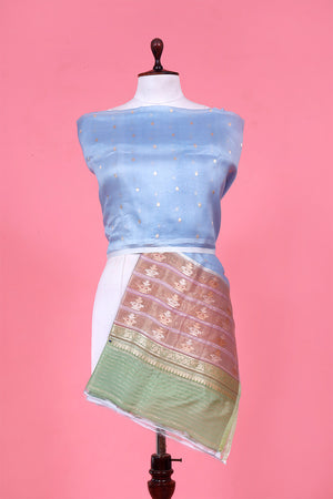 This organza silk dupatta is made from light, airy fabric. The powder blue color features exquisite kadhwa handloom weaving with gold zari woven buti all over, beautifully complemented by a contrast tissue pallu accentuated with gold and silver zari, along with meenakari woven floral buti and stripes.