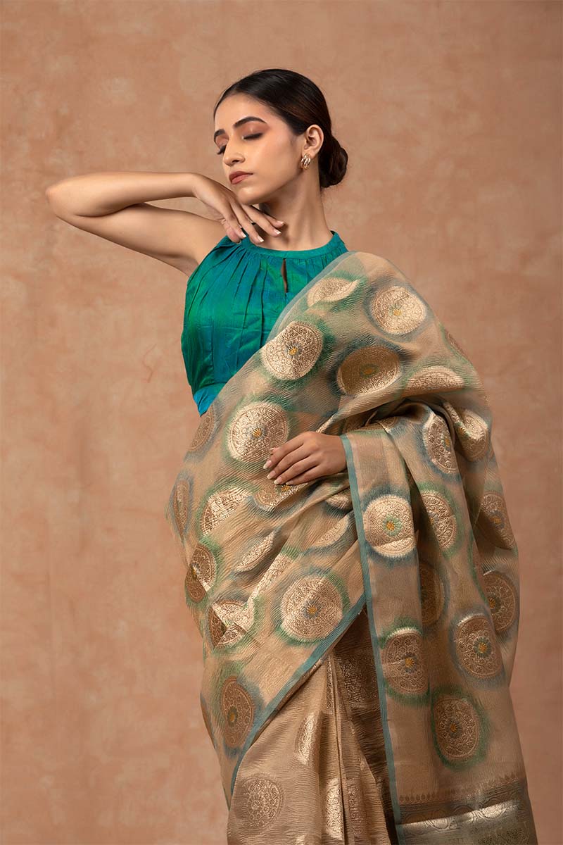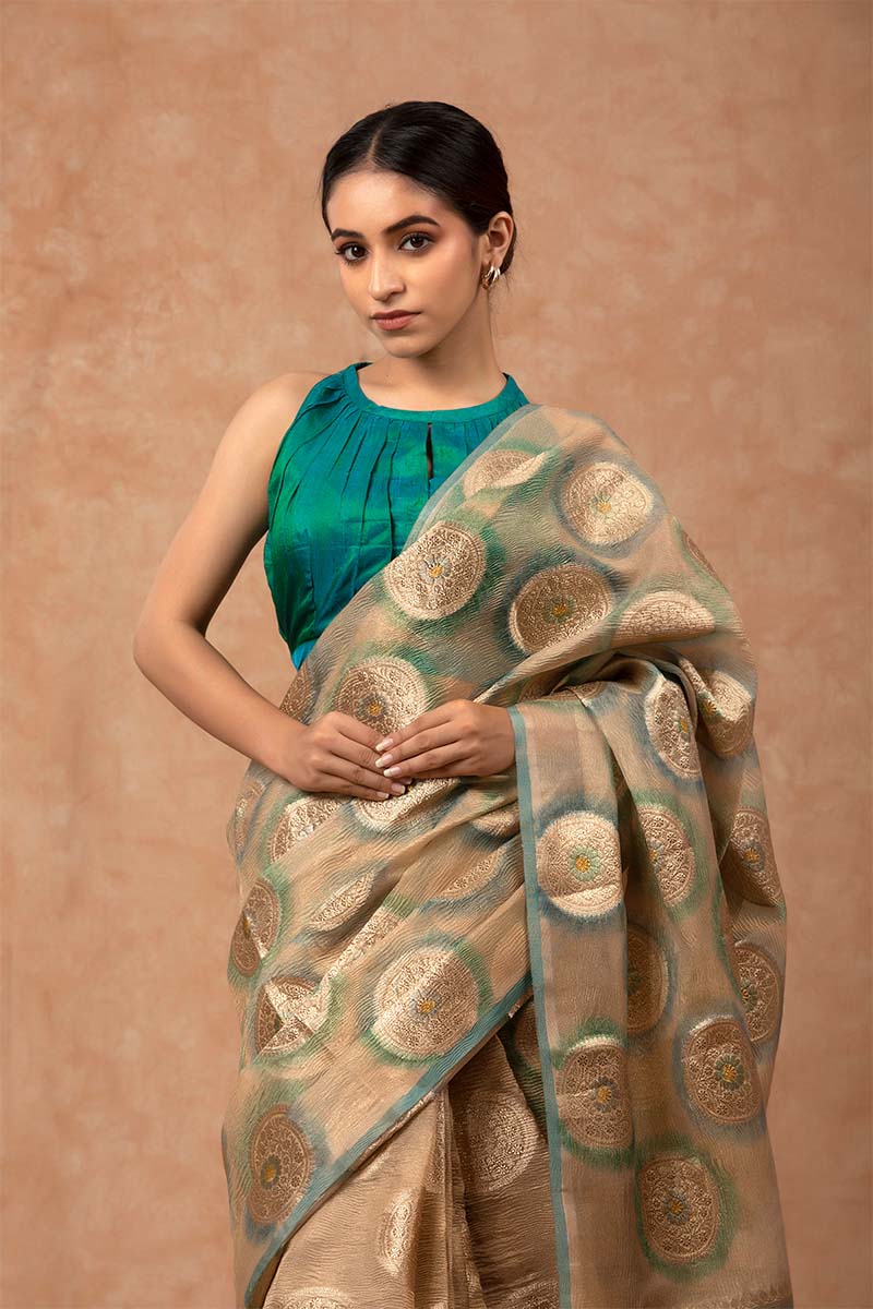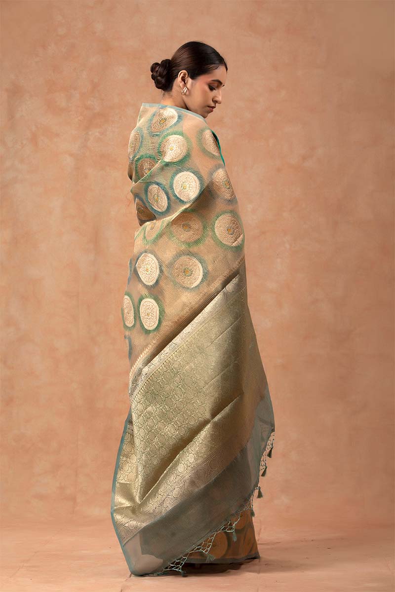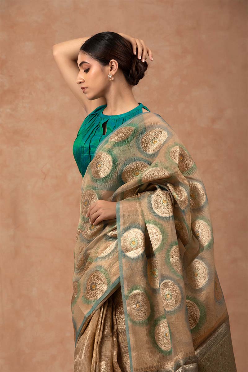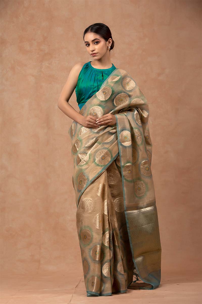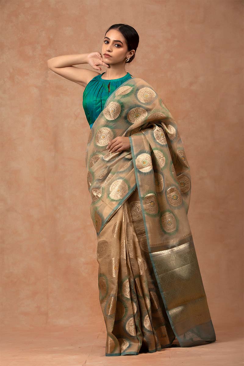 • The Saree is elevated with gold zari woven handbrushed floral buta.