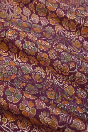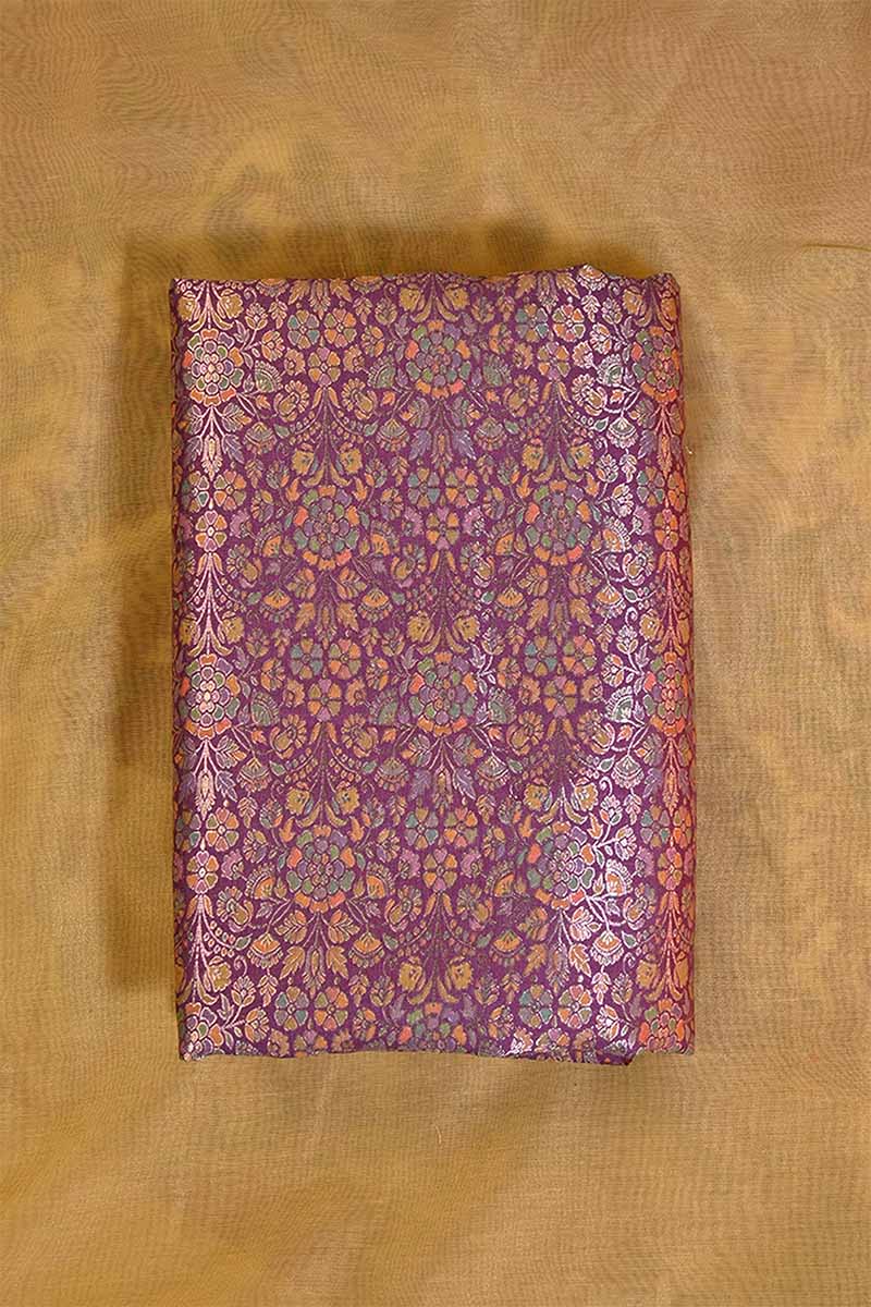 This purple Chiniya silk fabric features intricately woven floral jaal patterns in silver zari, beautifully enhanced with multicolor meenakari work. The contrast of fine silver detailing and vibrant accents makes it a perfect pick for creating standout blouses or dress pieces.