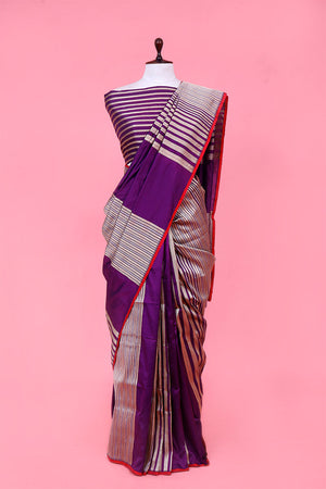 This purple Banarasi katan silk saree features handloom woven sona rupa (gold and silver) stripes that run throughout the saree and pallu. A delicate 1 cm peach piping along the edges adds a subtle contrast. The saree comes with a matching running blouse piece, perfect for versatile styling.