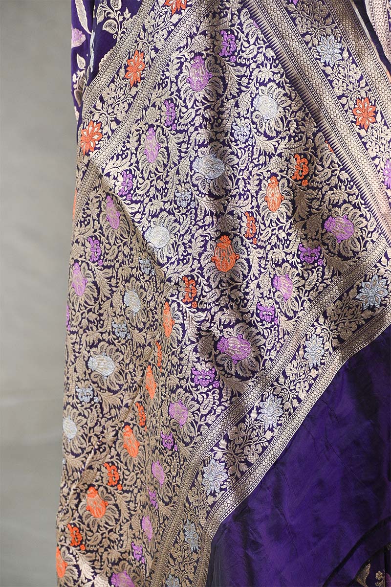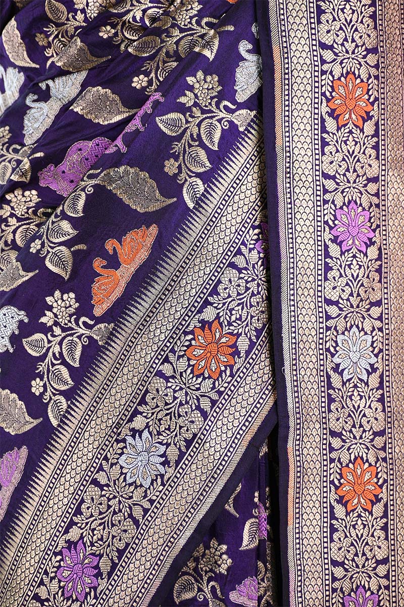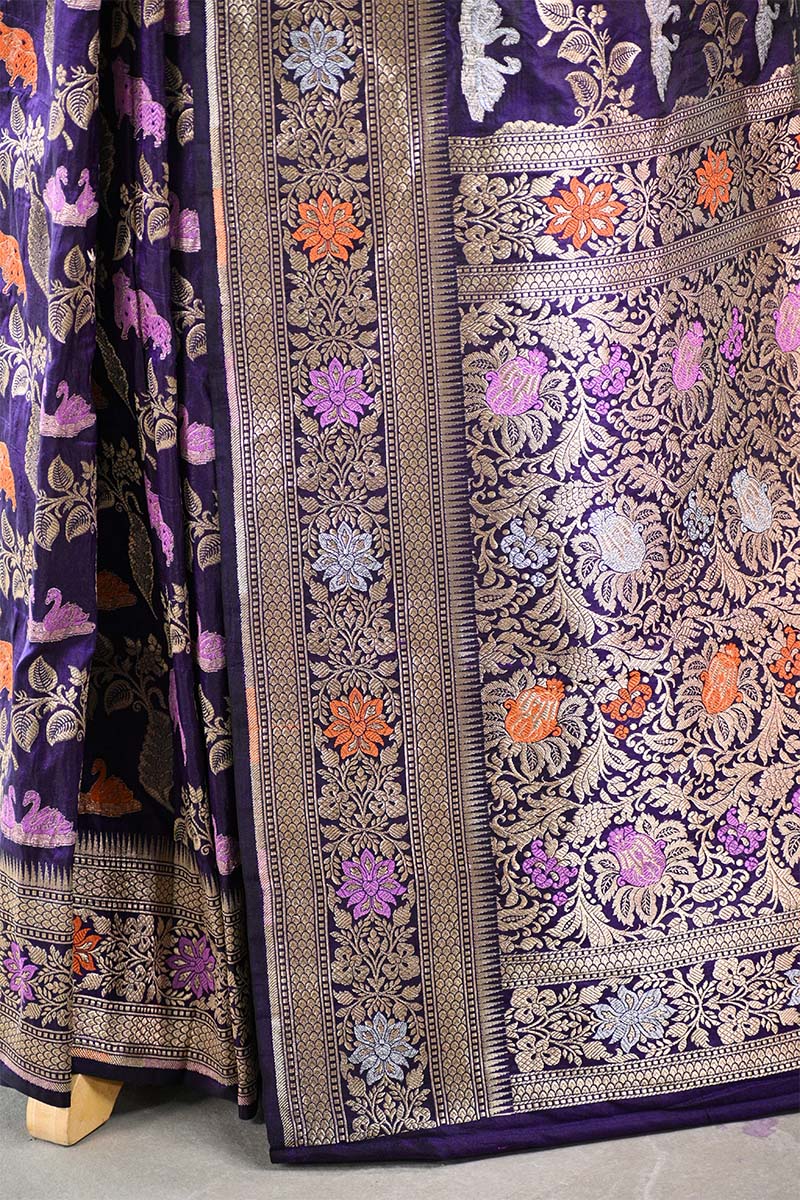 This purple pure Banarasi katan silk saree is woven with a gold zari floral jaal across the body, highlighted with resham meenakari cow and swan motifs. The border and pallu are intricately decorated with gold zari floral patterns, further enhanced with meenakari detailing. It is paired with a matching purple unstitched blouse piece finished with a zari woven border.