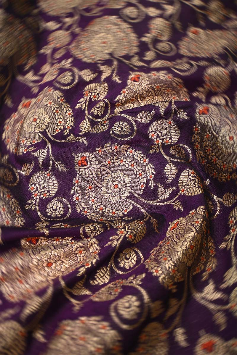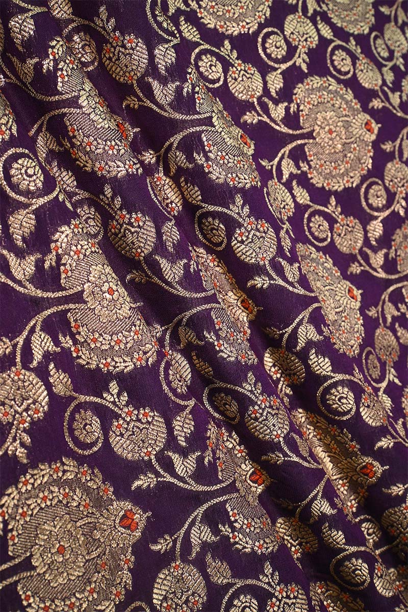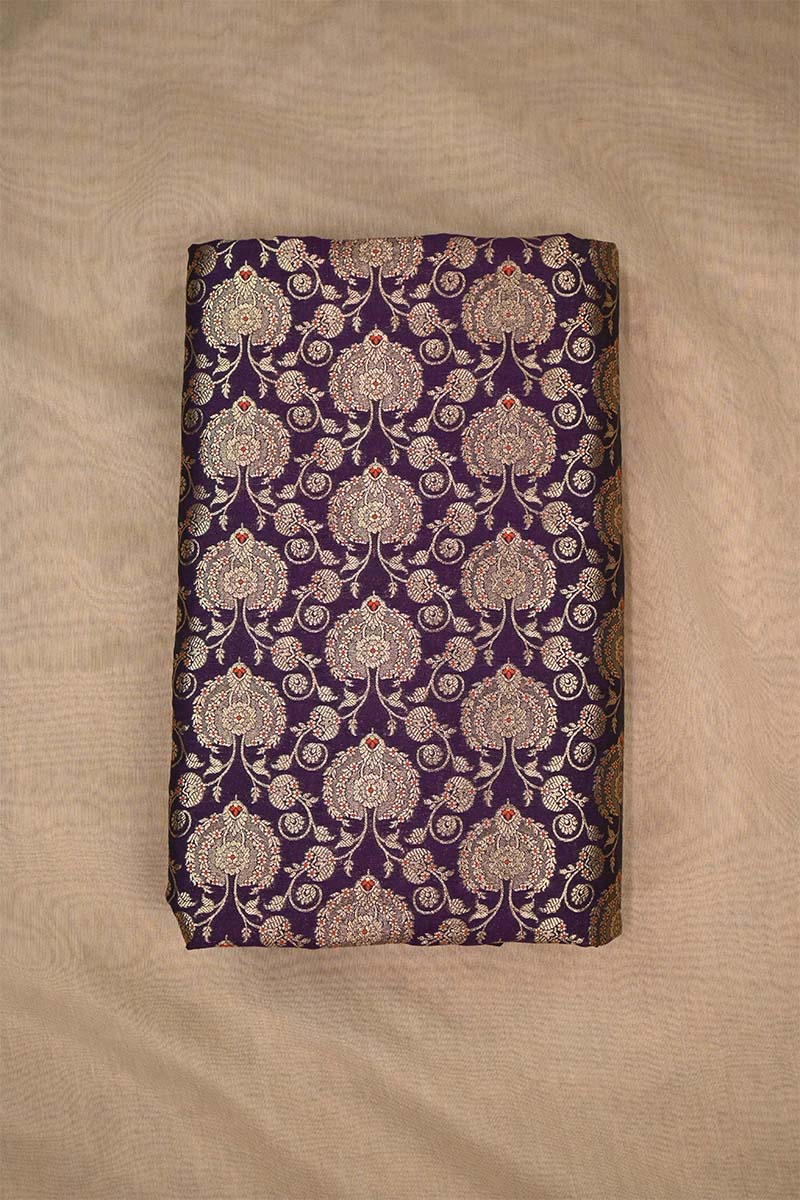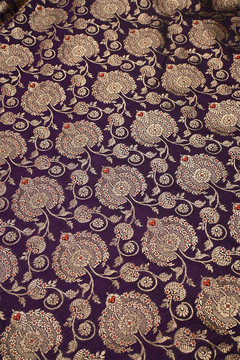 This purple Banarasi silk fabric is adorned with golden zari weaving, featuring floral motifs arranged in a leheriya-style jaal pattern. The design is further enhanced with intricate meenakari detailing, giving the fabric a distinct and decorative appeal.