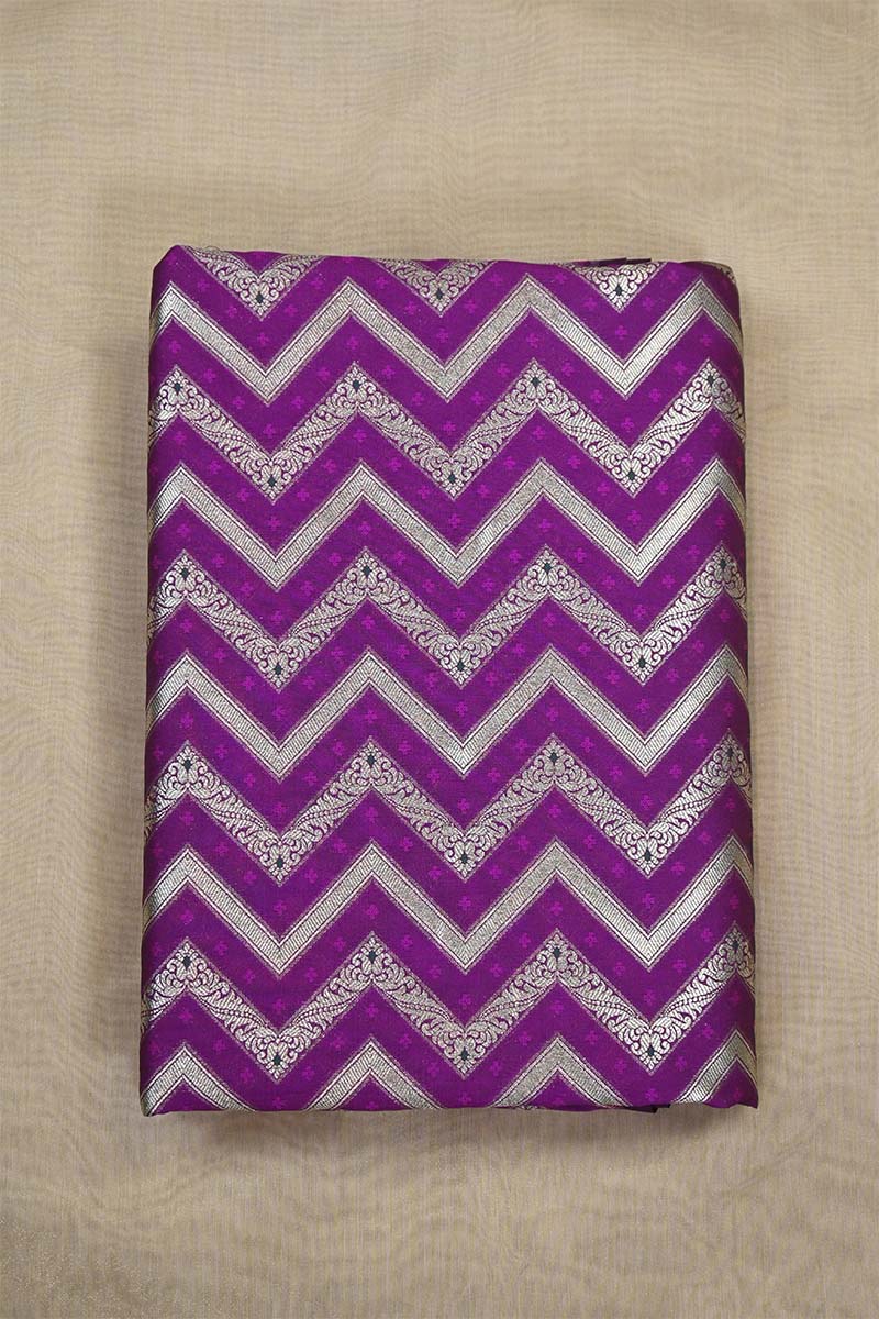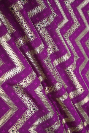 This Purple Banarasi silk fabric features alternating zig-zag zari woven stripe patterns, further enhanced with meenakari work all over. The bold stripe base color combined with intricate floral detailing makes it a classic choice for blouses or dresses.
