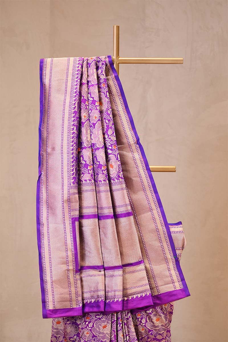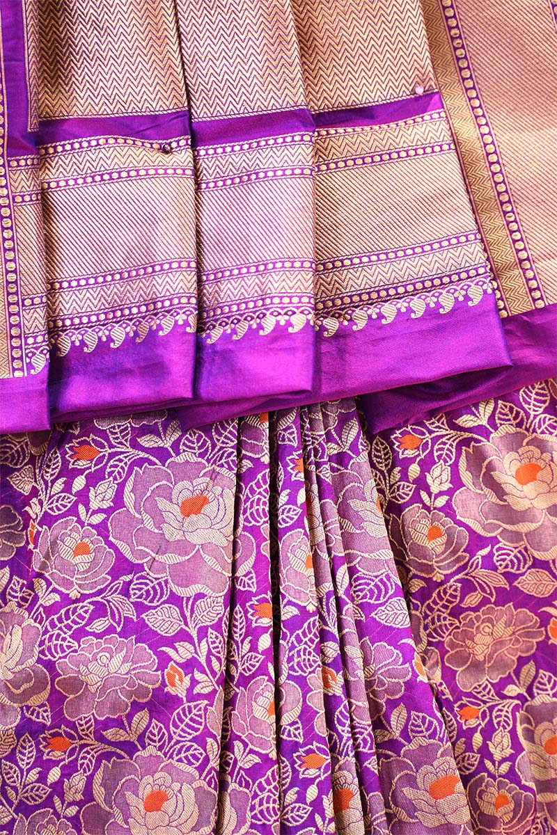 This Purple pure Banarasi katan silk saree is adorned with an intricate gold zari woven rose motif jaal, highlighted with orange meenakari detailing across the body. The border and pallu are woven with a geometric brocade pattern in gold zari. It is paired with a matching purple blouse piece finished with a gold zari woven border.