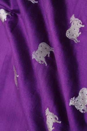 This Purple Banarasi Chiniya silk fabric features golden zari woven Pichwai cow motifs all over, inspired by the divine themes of Lord Krishna. The detailed cow pattern and rich base make it a great choice for crafting special wedding blouses or festive dresses.