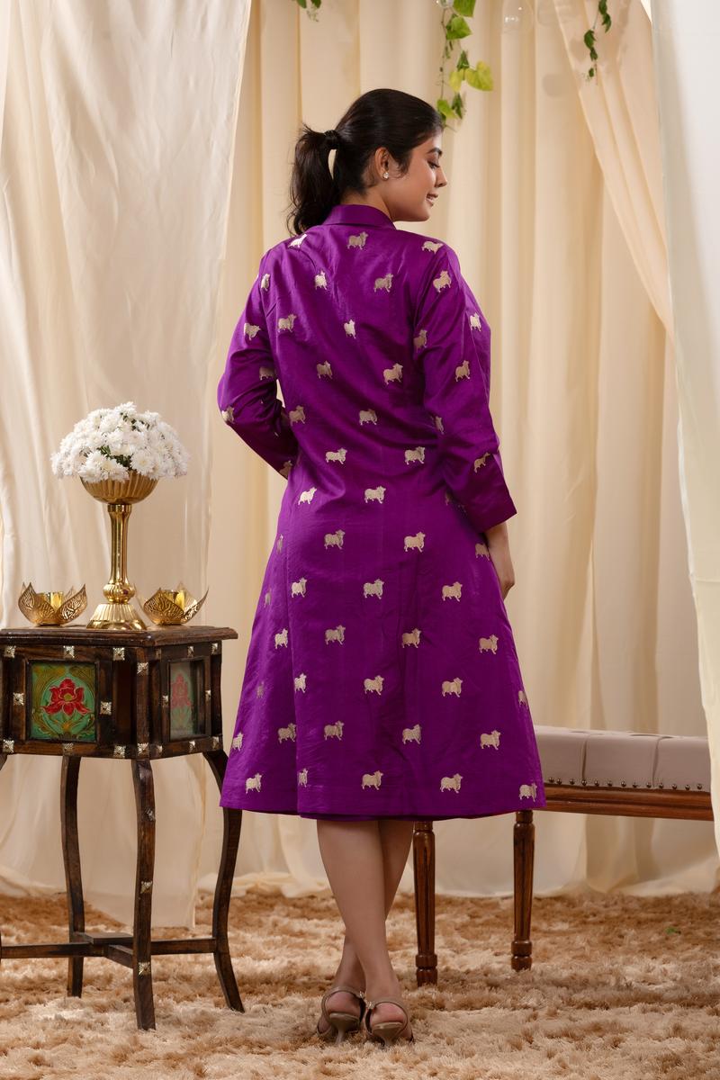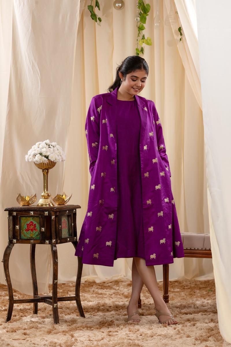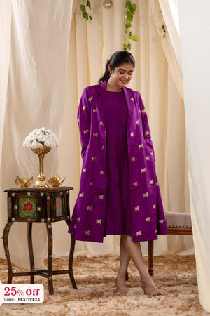 This Purple Chiniya silk co-ord set features cow (pichwai) zari motifs woven all over. The ensemble includes a longline, single-breasted Banarasi silk blazer with a notch lapel neckline, paired with a matching inner top in the same intricate weave. Designed for both style and comfort, it’s perfect for occasions where modern and ethnic styles meet.
