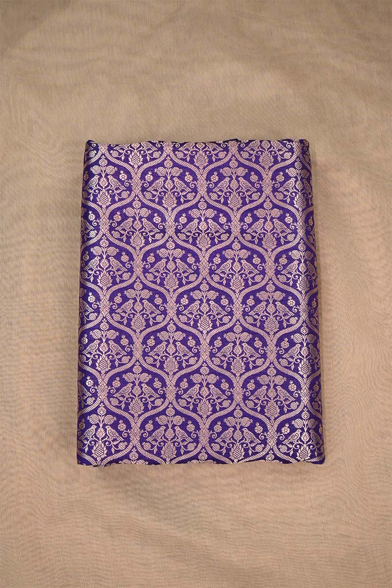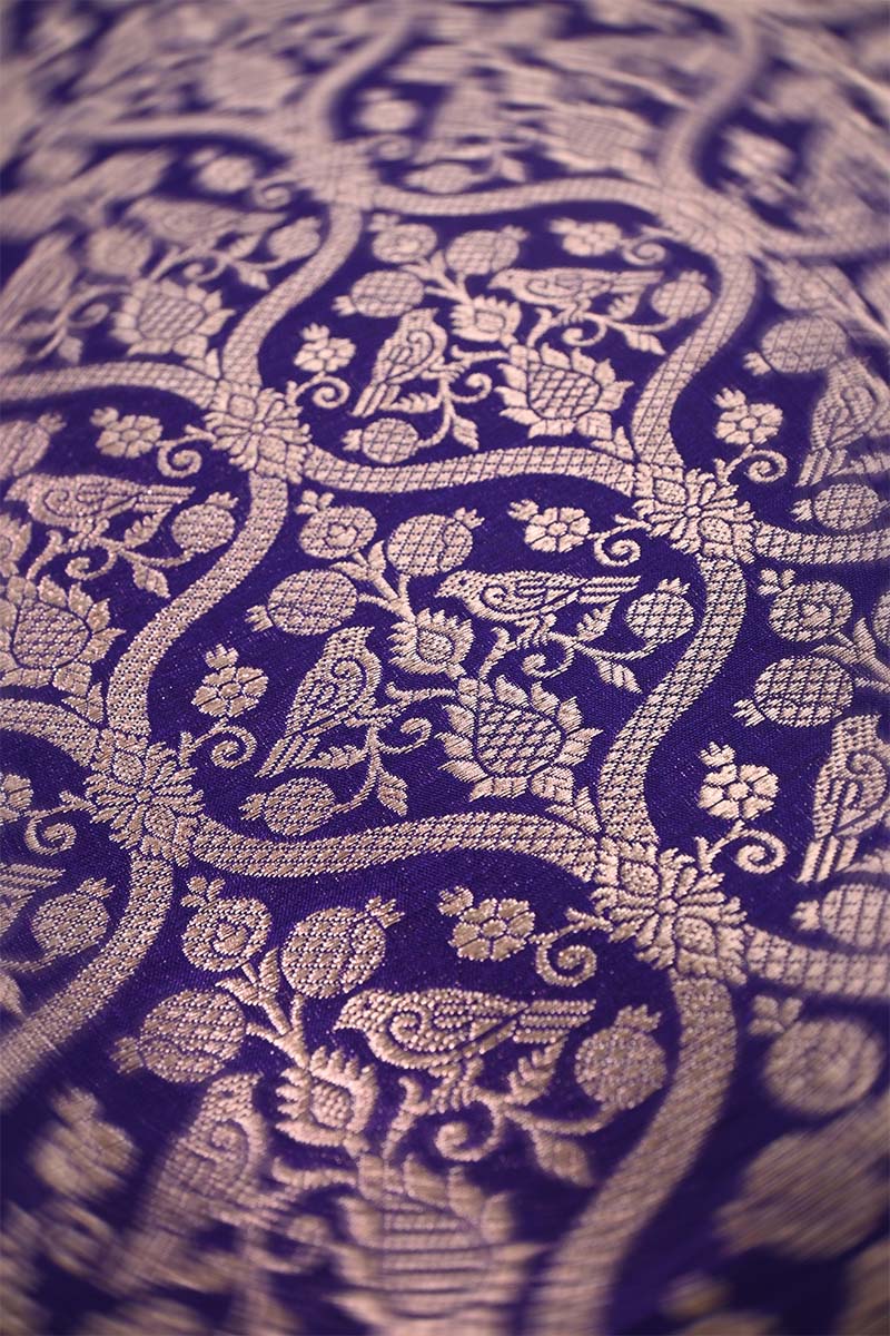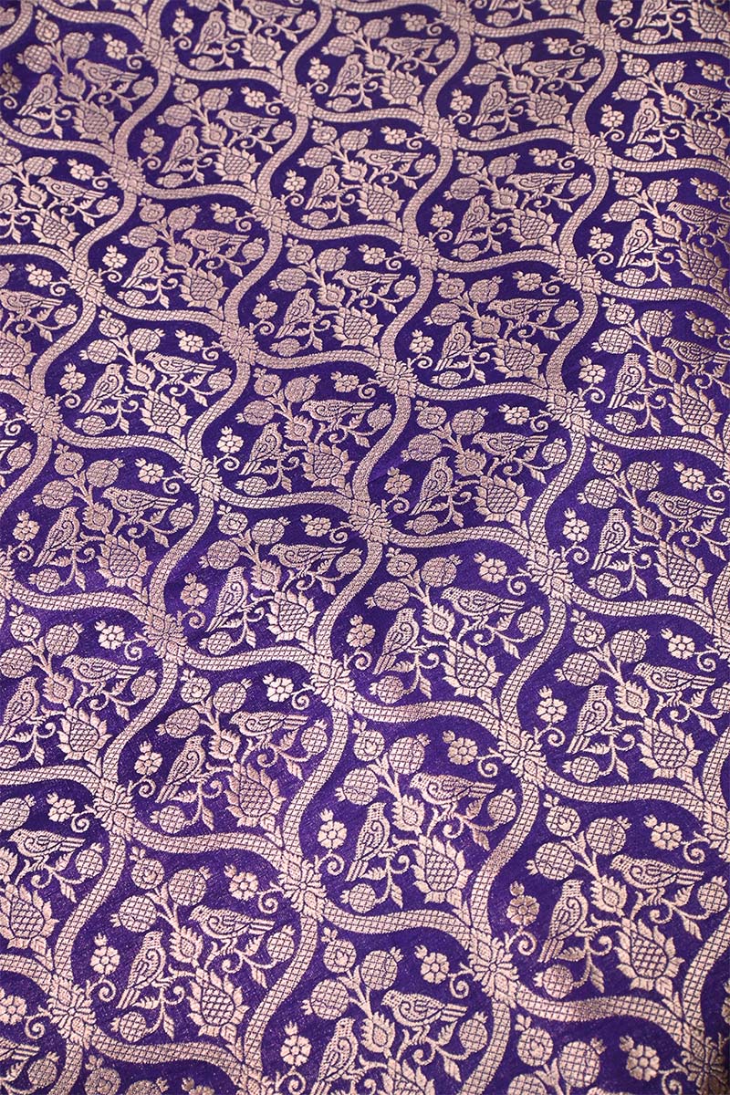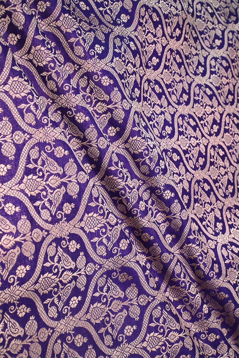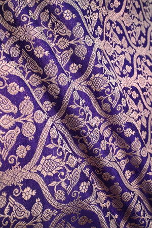 This purple Banarasi katan silk fabric is handloom woven with golden zari intricately woven in floral jaal with birds and pomigranate floral detailings in a leheriya-style brocade jaal pattern.