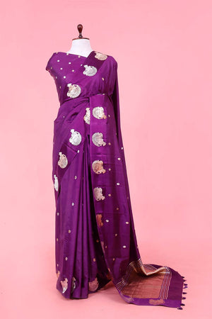 Styling Tips: Pair this Purple saree with traditional gold jewelry and a potli bag for a traditional festive look.