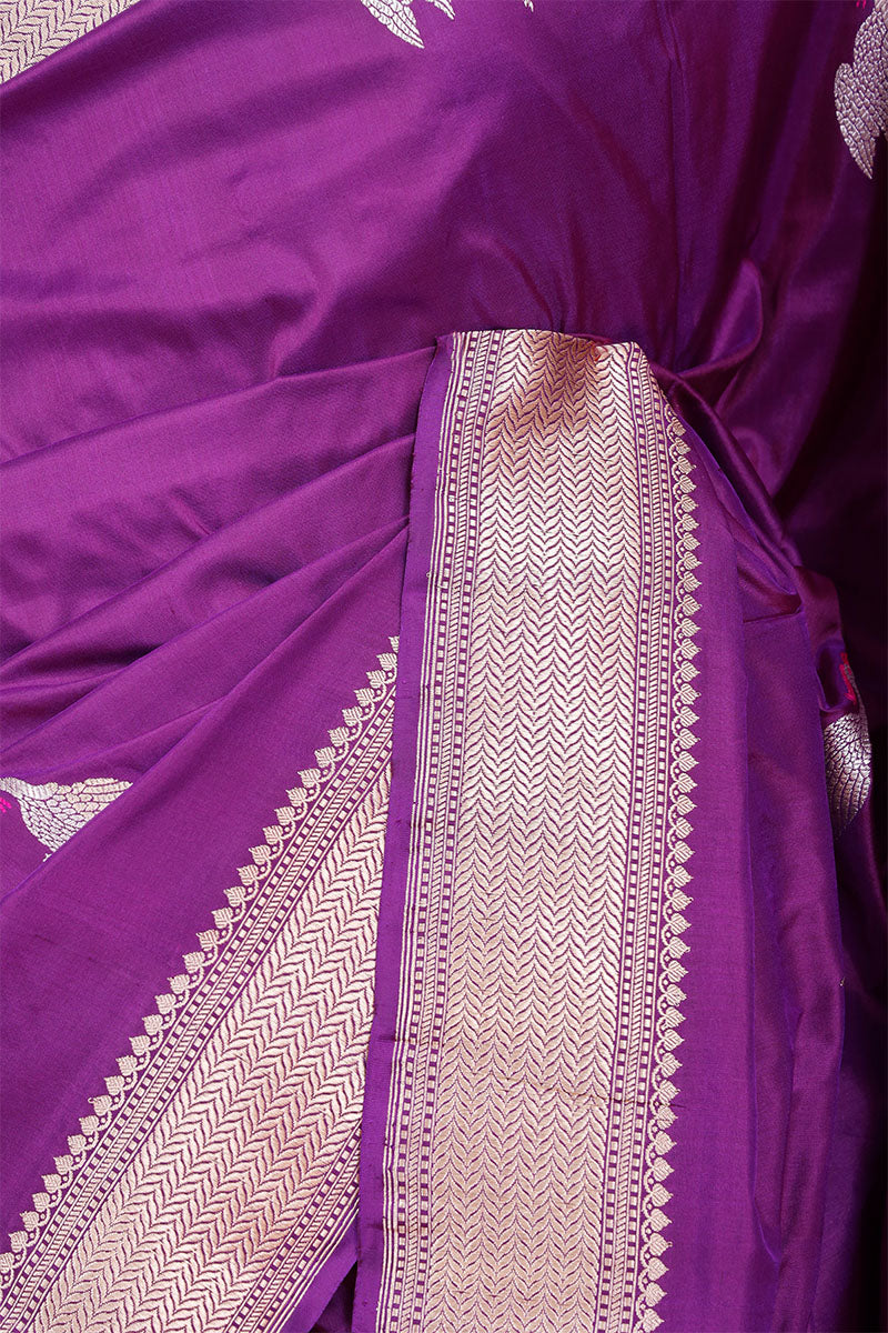 This purple handloom Banarasi saree is kadhwa woven with Katan silk material, beautifully adorned with intricate water gold zari and meenakari woven Agnipankh (Flamingo) motifs that gracefully cover the entire fabric. The saree features a stunning water gold zari woven border and pallu, adding an elegant touch. It comes with a matching running blouse piece, perfect for personalized styling.