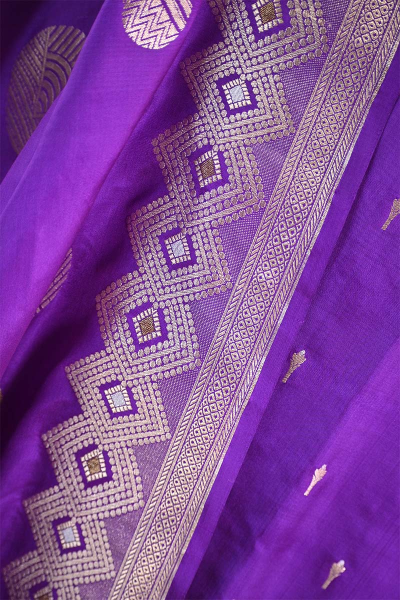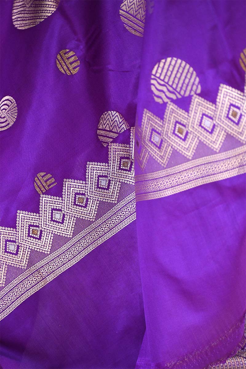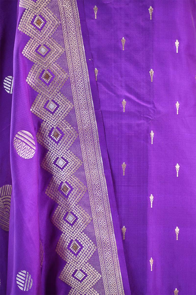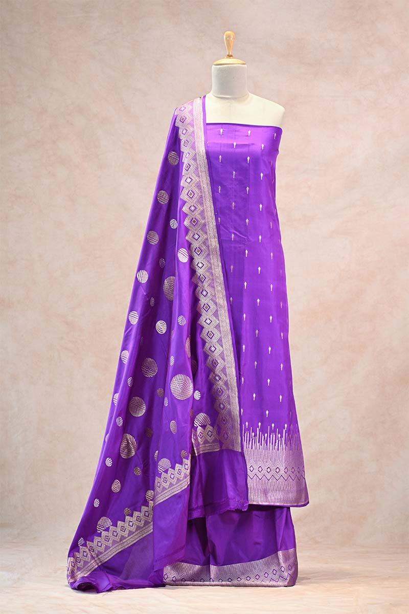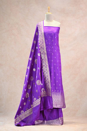 This Purple Unstitched Suit Set is made from Pure Katan Silk. The kurta is purely featured by it's neckline, where precision-woven gold zari floral jaal design is crafted. Created using traditional supplementary weft techniques. The set includes a running bottom fabric in a matching purple shade. The Kurta is complemented by a shaded organza silk dupatta, which incorporates manual needlework (hand embroidery) on the borders and is finished with machine-stitched lace detailing along the edges.