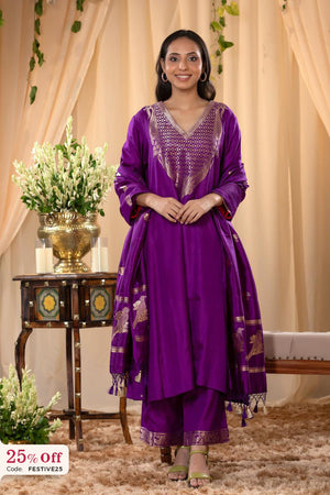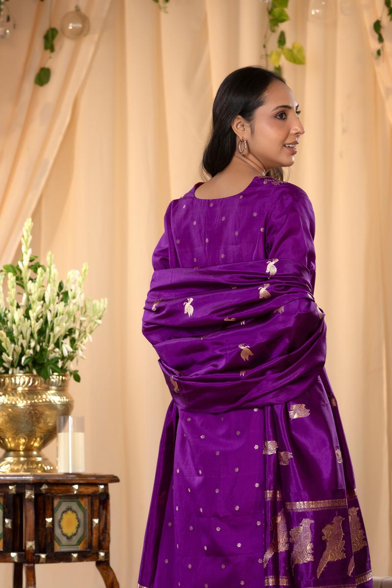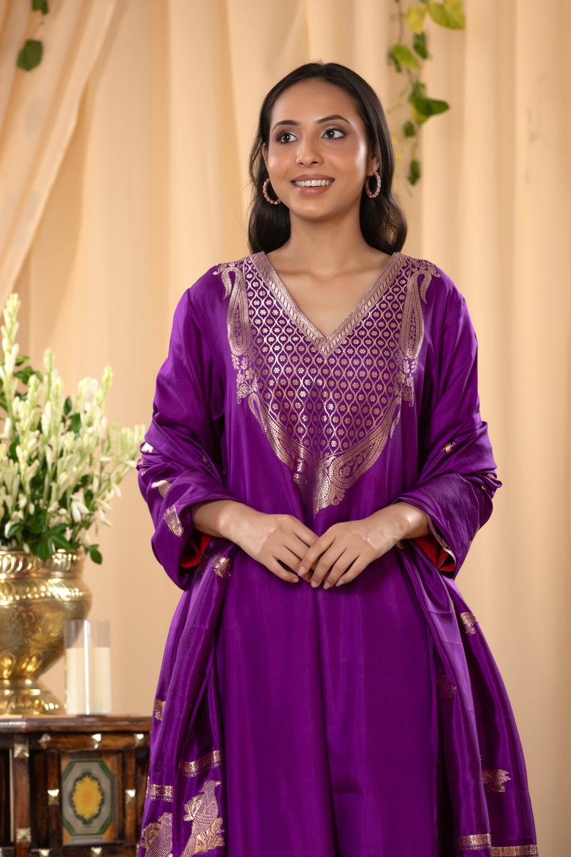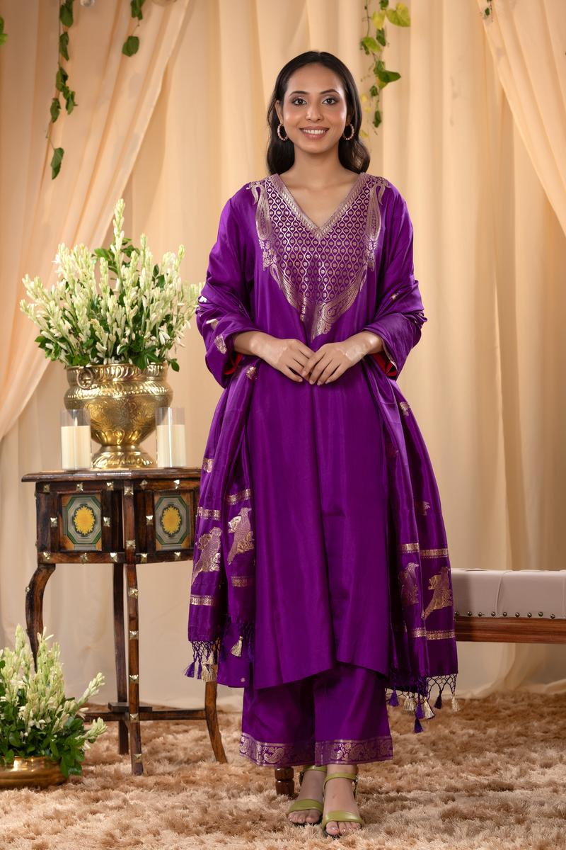 This Purple Katan silk suit set features a straight-cut kurti features a V-neckline, with the yoke highlighted by an intricate combination of zari jaal and paisley woven motifs. The back of the kurti is adorned with small gold zari motifs, giving it a unique look.