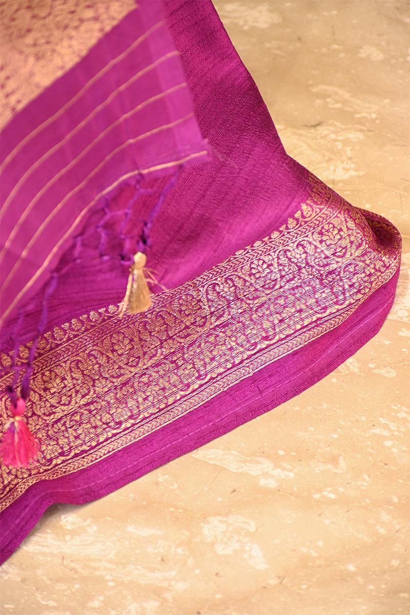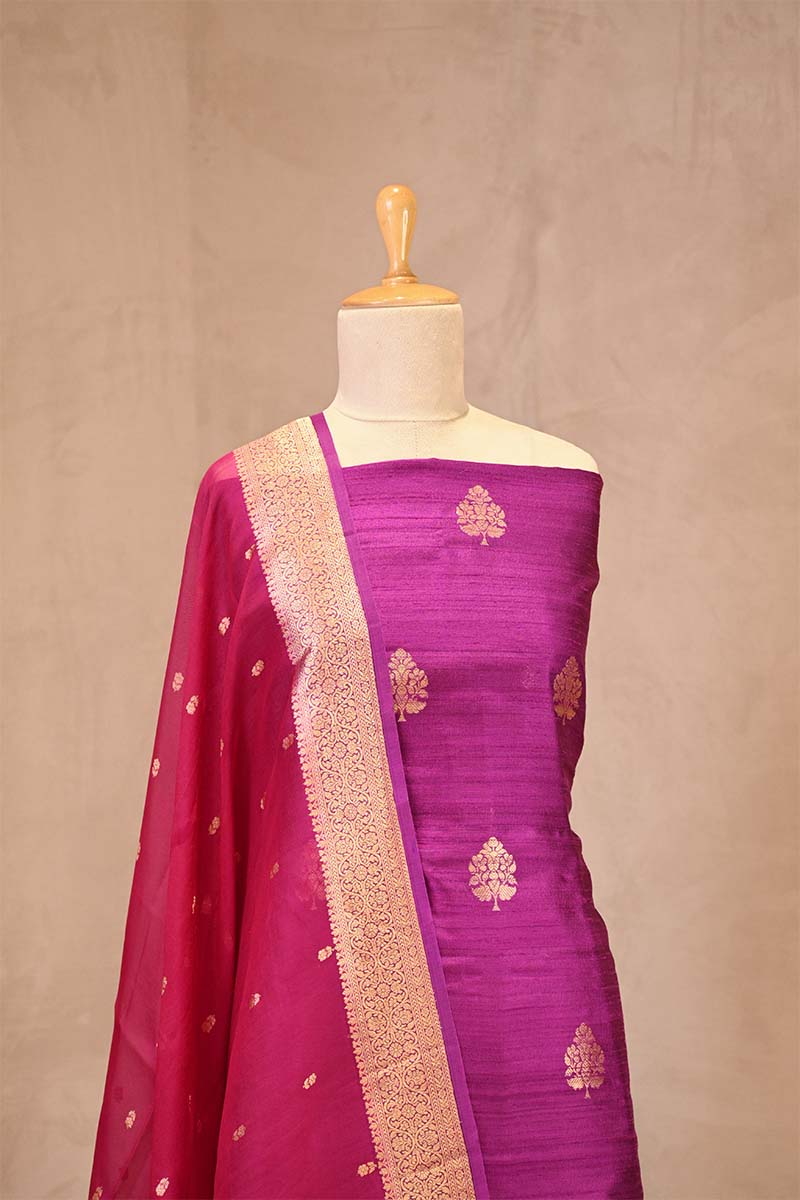 This purple raw silk banarasi suit set features delicate floral bootis woven across the body, highlighted with a rich golden zari border. It is paired with a coordinated bottom fabric and an attached Banarasi silk organza dupatta adorned with floral bootis, while the border of duppata is detailed with gold zari and finished with small tassels for an elegant look.