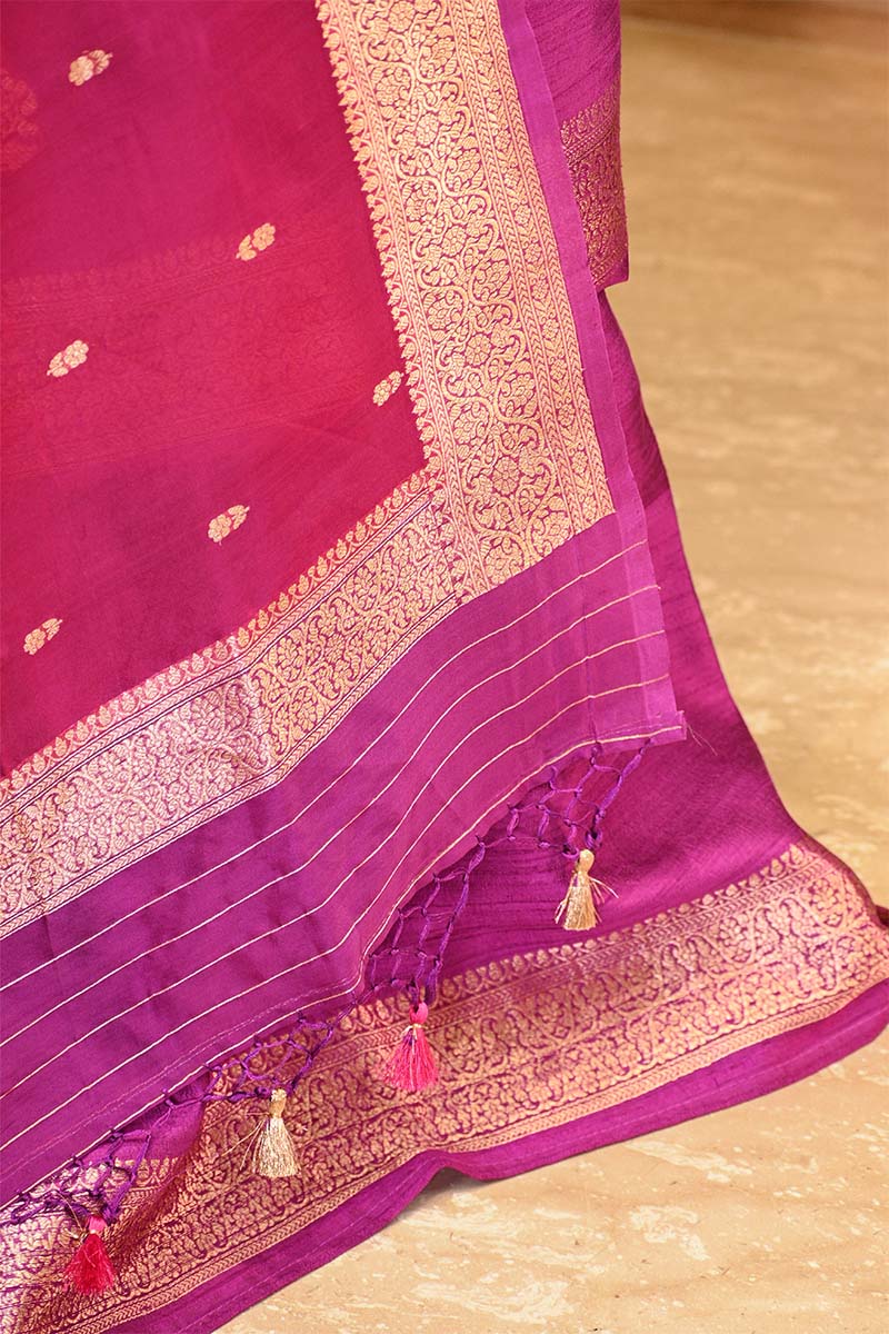 • Dupatta: Banarasi silk organza with floral bootis, gold zari pallu, and tassel finishing