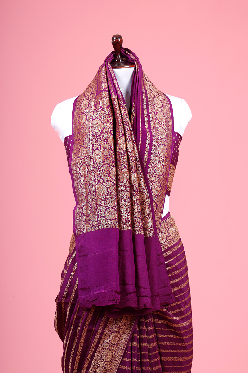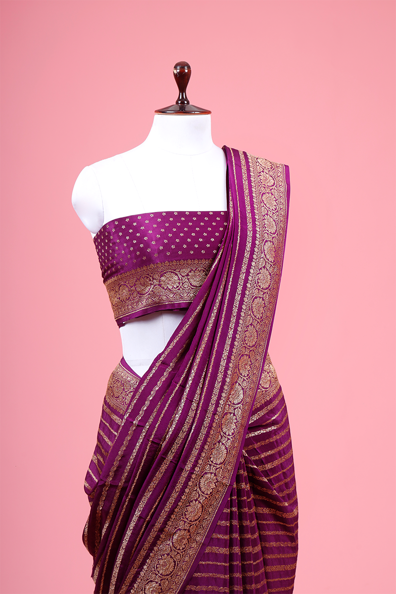 Introducing our exquisite Crepe Silk Saree, a fusion of tradition and modern sophistication. Adorned with antique zari-woven stripes throughout, it exudes timeless charm. The border and pallu feature intricate floral motifs woven with antique zari, adding an elegant touch. Accompanied by a matching unstitched blouse piece, this saree is a symbol of refined luxury, perfect for elevating your traditional ensemble with its impeccable craftsmanship and understated allure.