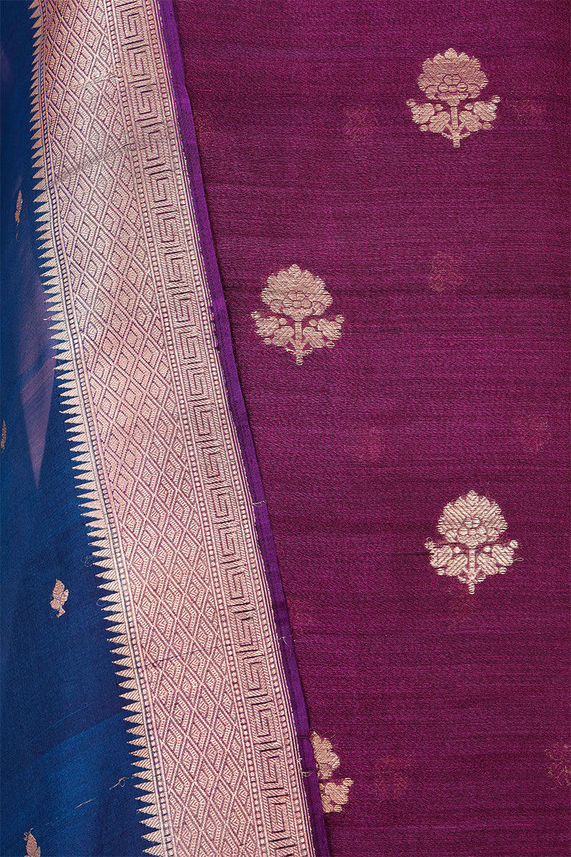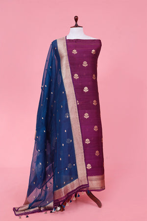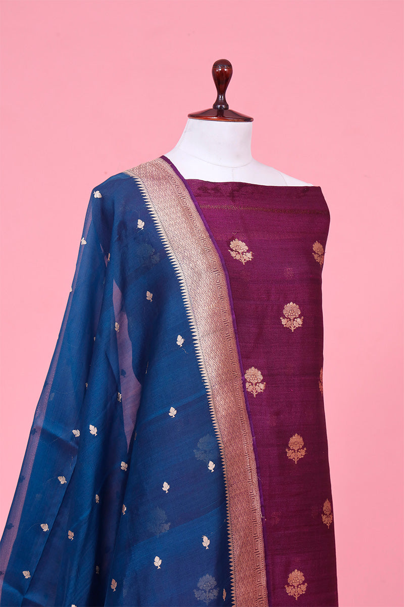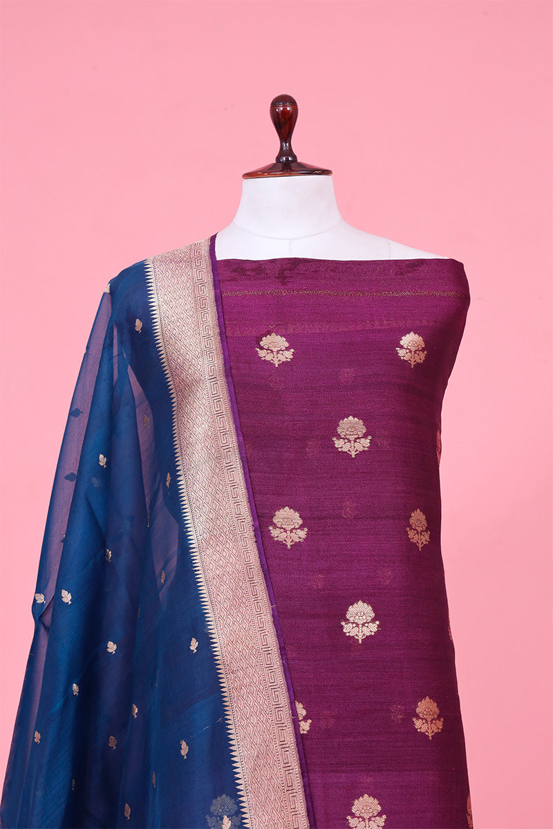 This purple Tussar silk dress material is a stunning choice for festive and wedding occasions. The kurta is beautifully adorned with gold Kadhwa woven floral buta and features an intricate border, adding a touch of elegance to your outfit.