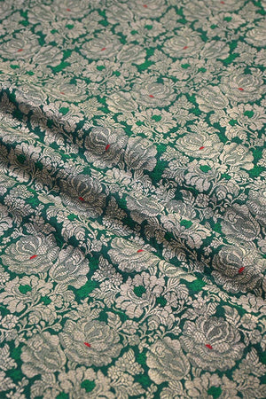 This Rama Green Banarasi silk fabric features a golden zari woven rose floral brocade jaal design, beautifully adorned with Red resham meenakari detailing. The combination of floral motifs with meenakari highlights makes it an excellent choice for festive and wedding wear.