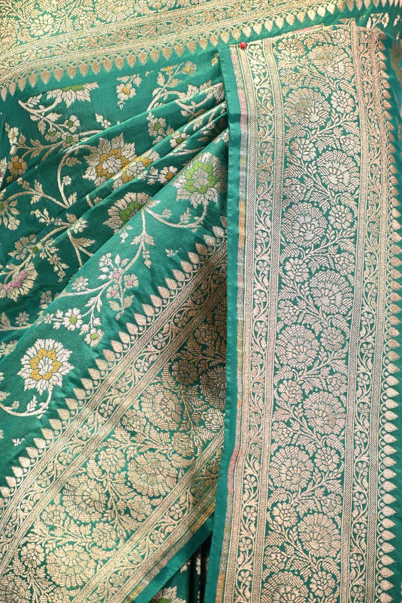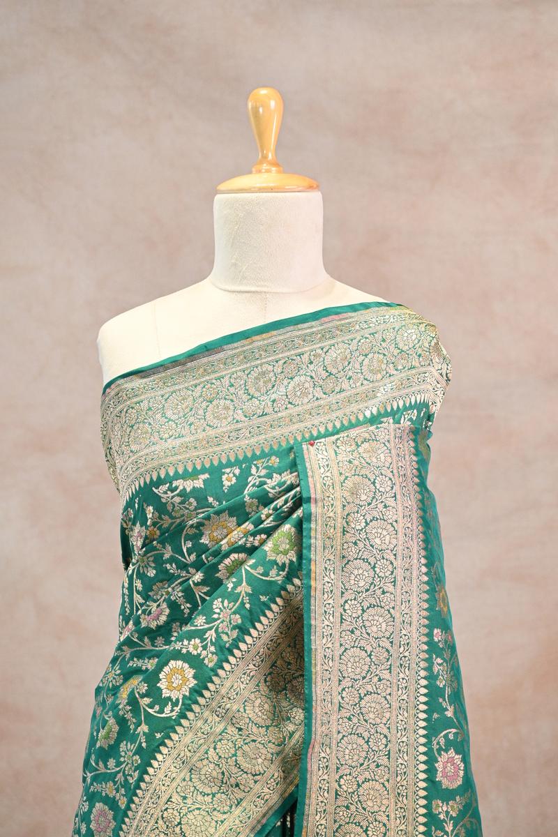 This Rama green semi-silk Banarasi saree is crafted on a blended silk base that gives a rich look and a well-defined drape. The body is adorned with a continuous gold zari-woven floral pattern, highlighted with resham weaving to add subtle texture and depth. The border and pallu feature elegant floral gold zari weaving, enhancing the traditional appeal of the saree. It comes with a matching unstitched blouse piece.
