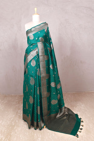 This Rama green saree is woven with gold zari Paisley motifs and small floral motifs spread across the chiniya silk body, creating a balanced and intricate design. The saree is further accentuated with a floral antique zari woven border and pallu, adding depth to its traditional appeal. It comes with a matching unstitched blouse piece for custom tailoring.