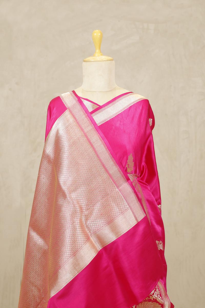This rani pink Banarasi saree is handloom woven with gold zari peacock motifs across the body woven with pure satin silk threads. The border features a stunning combination of gold zari woven floral and peacock motifs, while the pallu is intricately designed with a gold zari woven geometric pattern. It comes with a matching unstitched blouse piece, perfect for custom tailoring.