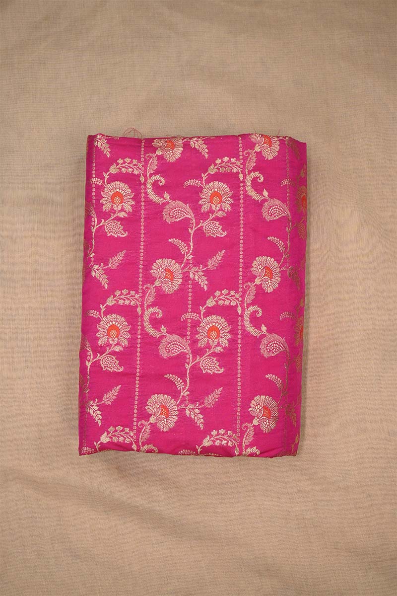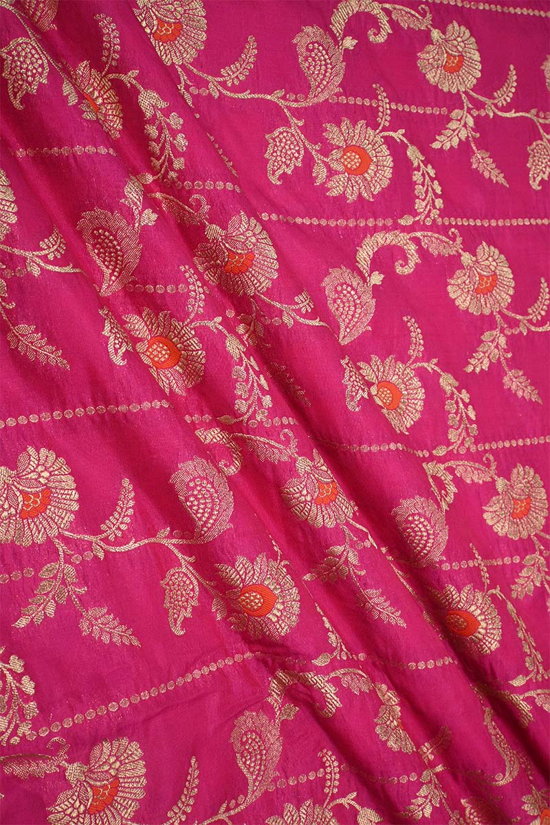 This rani pink dual-tone Banarasi silk fabric is detailed with golden zari floral motifs arranged in a vine-inspired leheriya jaal pattern. The design is further enhanced with orange meenakari work, adding depth and contrast to the overall look of the fabric.