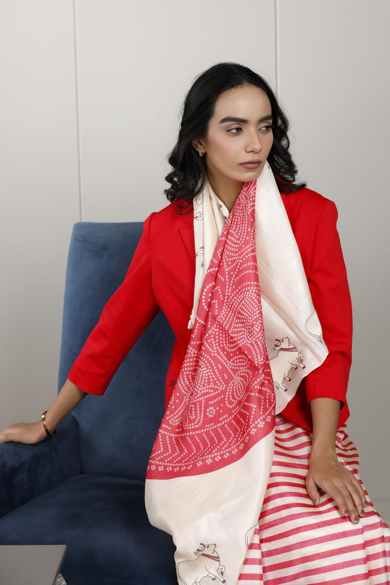 This red and white tussar silk saree is woven for a formal yet expressive office look. The body is adorned with red vertical stripes that bring structure to the design. The plain border is elevated with embroidered Nandi motifs, adding a hint of cultural flair. The pallu features circular ethnic Bandhani-printed motifs. It comes with a red Bandhani printed unstitched blouse piece to complete the look.