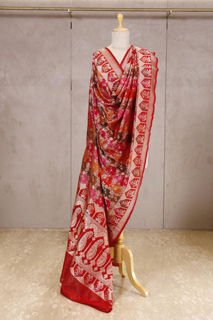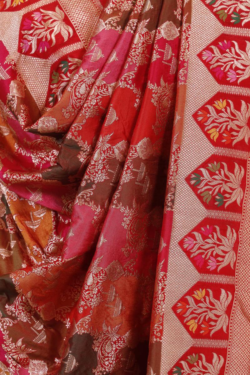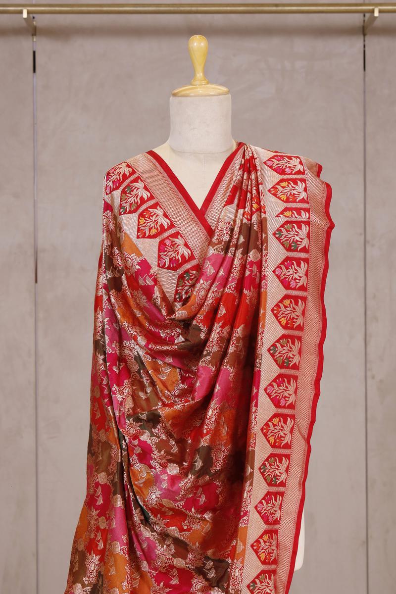 This rangkat Banarasi dupatta is woven from pure Katan silk threads. This dupatta is rangkat multicolor stunning gold zari woven floral jaal pattern throughout, complemented by a gold zari woven pallu and border.