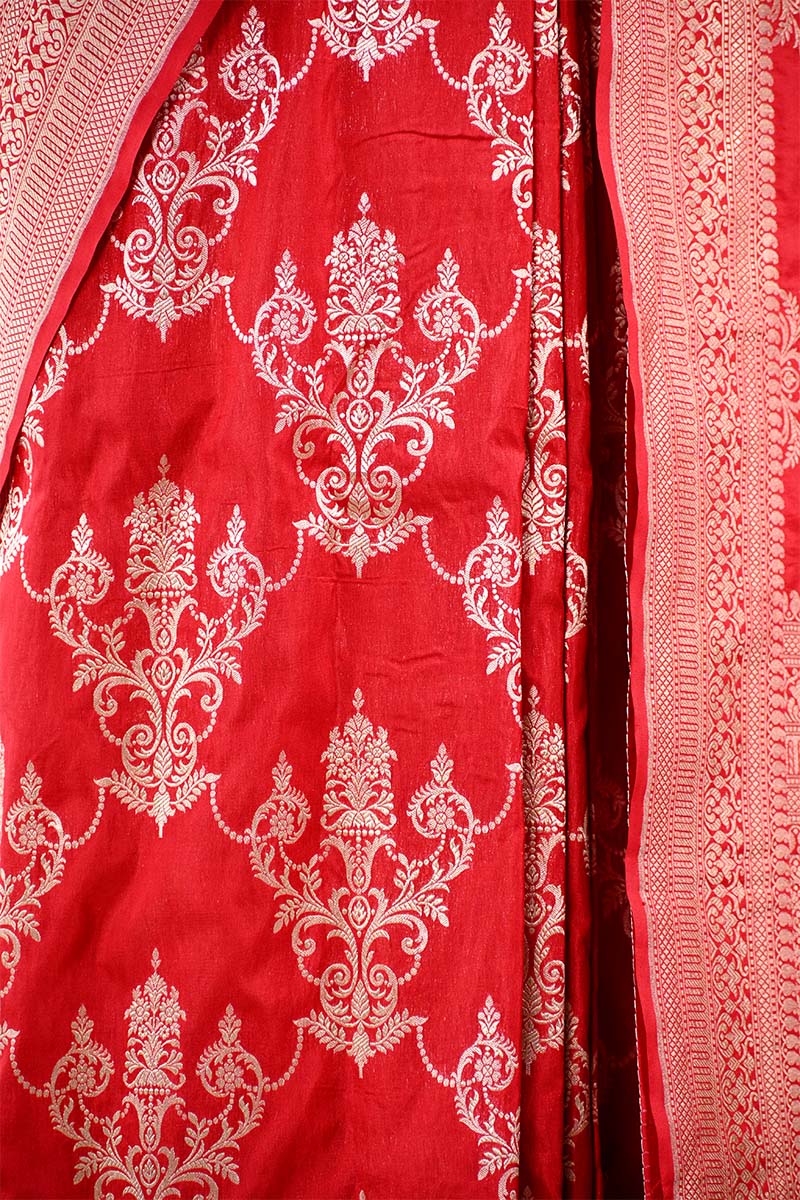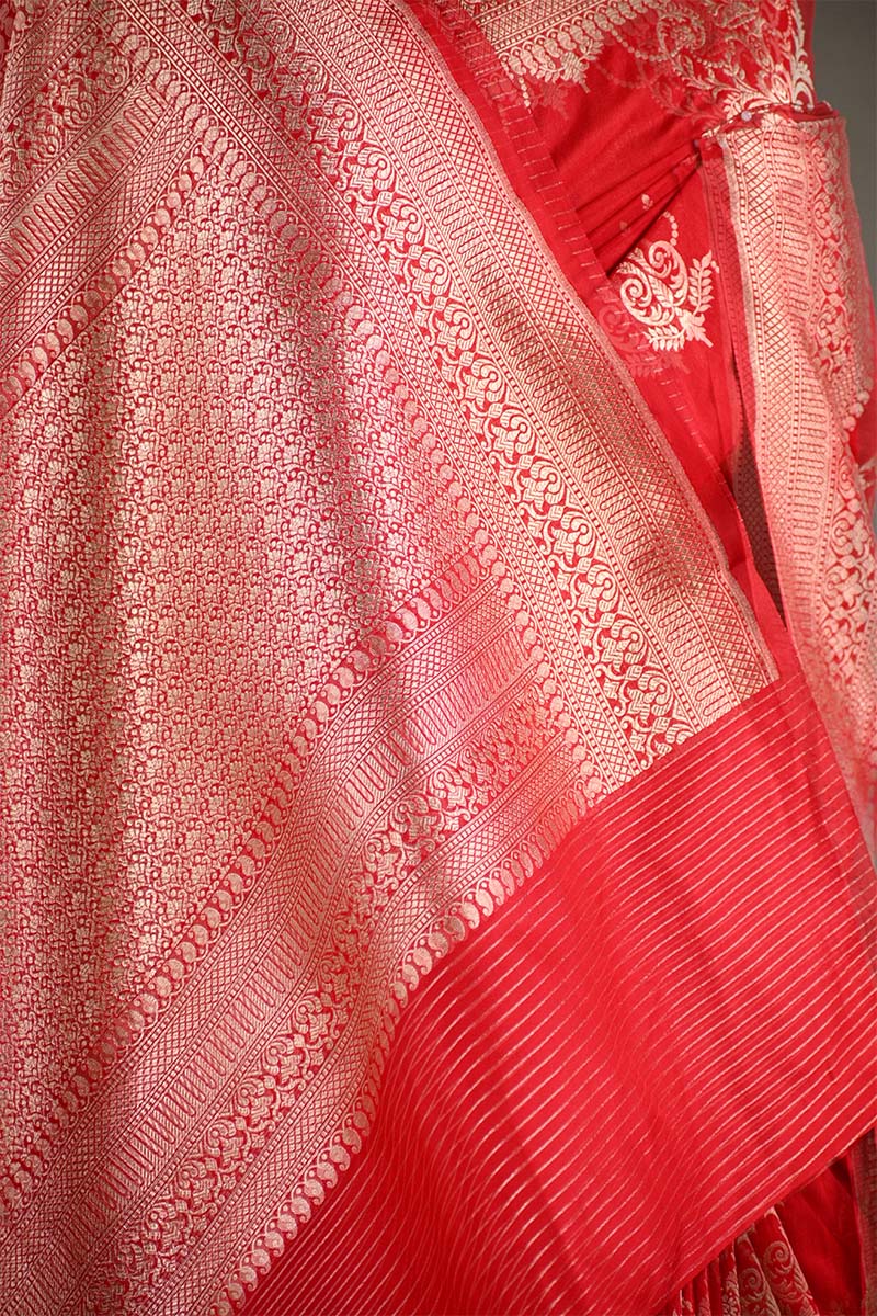 This red pure Banarasi katan silk saree is adorned with floral gold zari woven ornaments inspired by royal architectural patterns across the body. The border and pallu are decorated with ethnic floral gold zari designs, adding a traditional touch. It is paired with a matching pink unstitched blouse piece finished with a golden zari woven border.