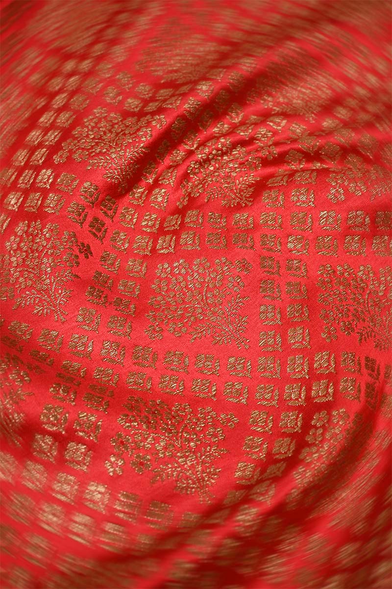 This red Banarasi silk fabric features antique zari-woven floral motifs arranged in a criss-cross pattern, further highlighted with floral buta motifs placed in between. The traditional design and rich texture make it a suitable choice for creating blouses, lehengas, or cultural attire.