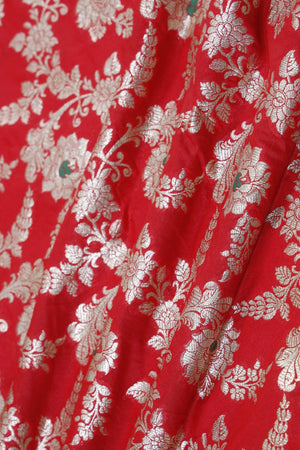 This red Banarasi silk fabric features an intricate gold zari floral jaal design woven all over, highlighted with green meenakari detailing on the flowers. Made with a blend of 90% pure silk and 10% semi-silk, it offers both beauty and durability—perfect for designing standout blouses or dresses.