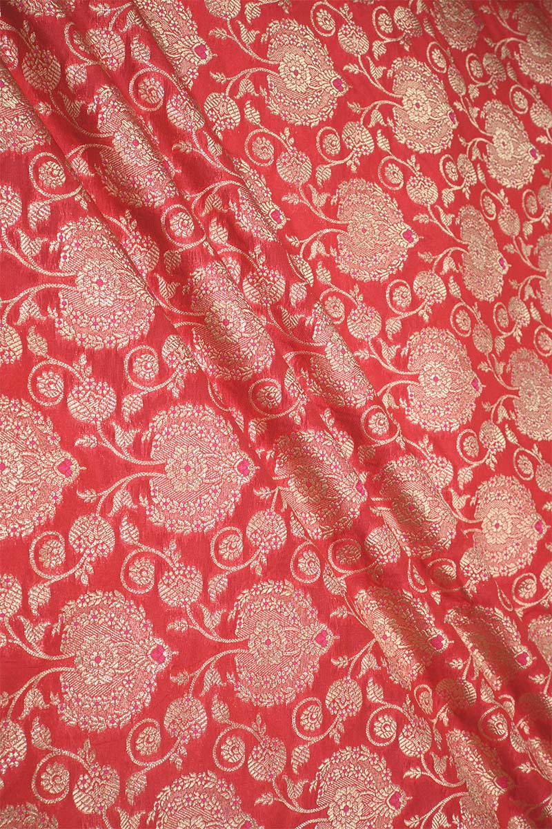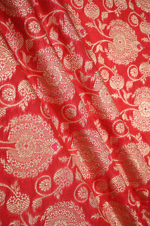 This red Banarasi silk fabric is adorned with golden zari weaving, featuring floral motifs arranged in a leheriya-style jaal pattern. The design is further enhanced with intricate meenakari detailing, giving the fabric a distinct and decorative appeal.