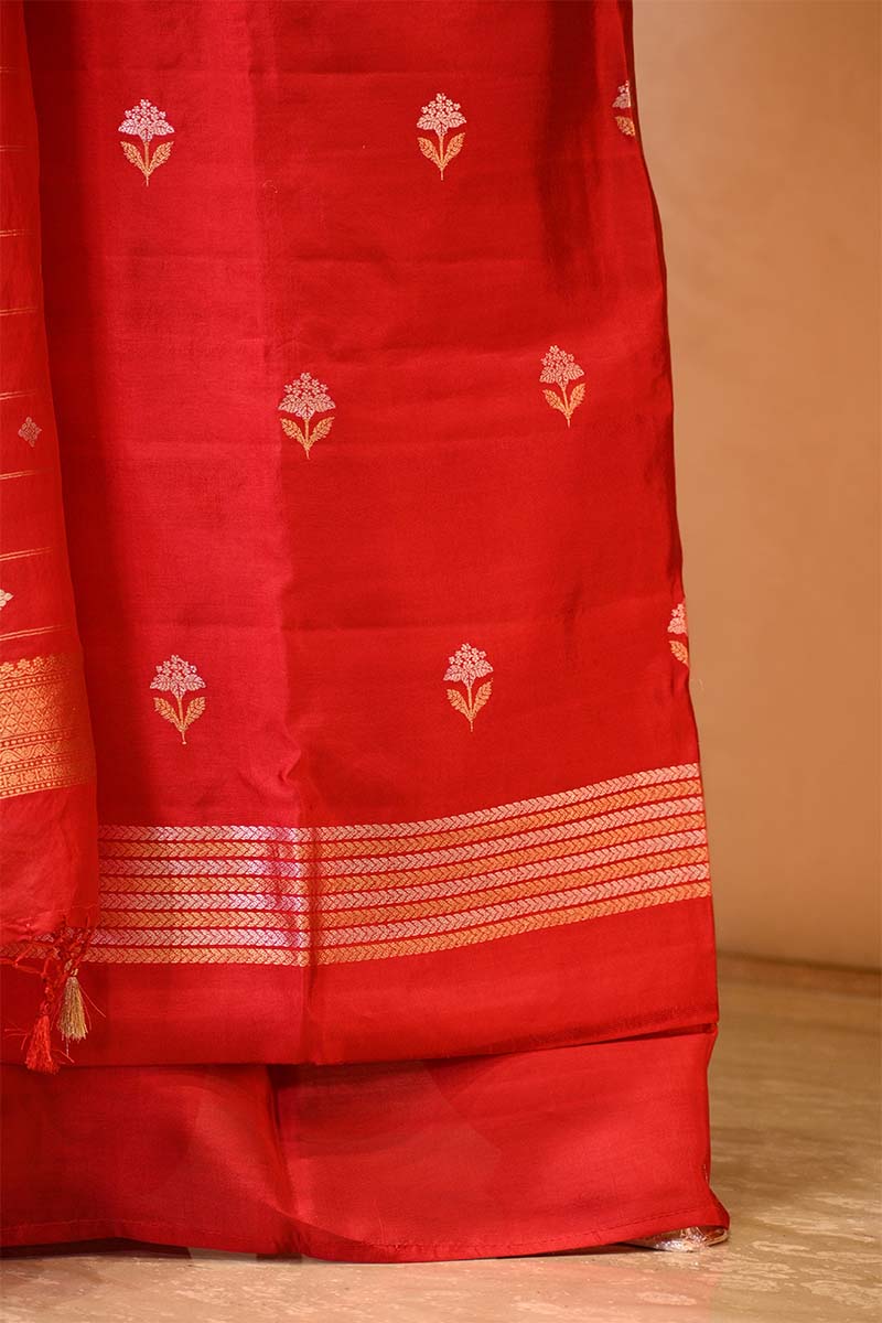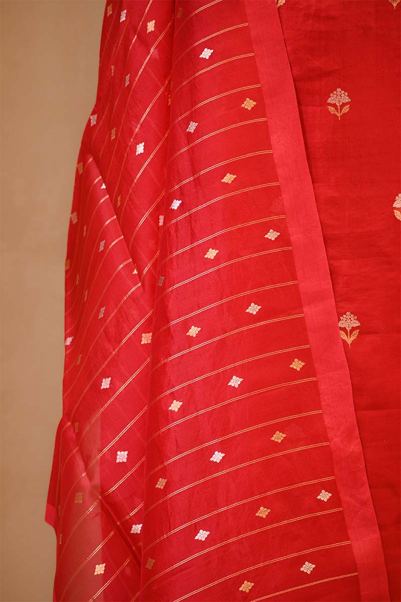 This Red banarasi silk salwar suit features gold and silver zari woven floral motifs all over the kurta, accentuated with a gold and silver zari woven border along the hemline. It is paired with a coordinated Red Banarasi silk bottom fabric and complemented by a red organza silk dupatta, woven with gold zari buti all over and finished with satin border.